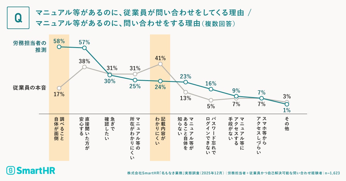 この事象に対し、担当者の58%は「(従業員が自分で)調べること自体が面倒」と推測していますが、従業員は「記載内容がわかりにくい(41%)」や「マニュアルの所在がわかりにくい(31%)」といった情報の到達性・アクセシビリティ課題を理由として多くあげており、担当者の推測と従業員の本音には乖離があることが確認できます。