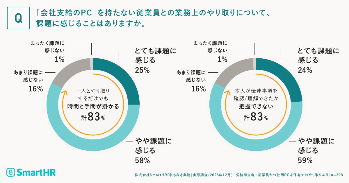 株式会社SmartHR(本社:東京都港区、代表取締役CEO:芹澤 雅人)は、労務管理システム導入済みかつ従業員数51名以上の企業に勤務する労務管理者および従業員1,790名を対象に、「『名もなき業務』実態調査(2025年12月)」を実施しました。本調査では、多くの企業で年末調整や労務手続きのシステム化が進む一方で、従業員への周知・確認・問い合わせ対応・督促といった『名もなき業務』が依然として担当者の時間を奪っている実態が明らかになりました。特に、店舗・工場・配送スタッフなどのノンデスクワーカーを抱える企業では、企業と従業員の情報伝達に構造的な課題が浮き彫りになっています。