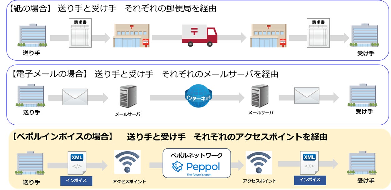 ペポルインボイスは、送り手と受け手それぞれがアクセスポイントを経由して電子メールのようにデジタルインボイスを送受信する仕組みで、双方が利用するシステムが異なっていても、ペポルネットワークに参加する全てのユーザーとやりとりすることができます。