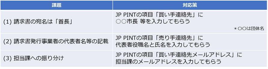 ただ、いずれの対応策も請求書の送り手(事業者)側での設定事項となるため、市区町村がペポルインボイスを受領するには、事前に事業者へ提示し対応してもらう必要があると考えています。