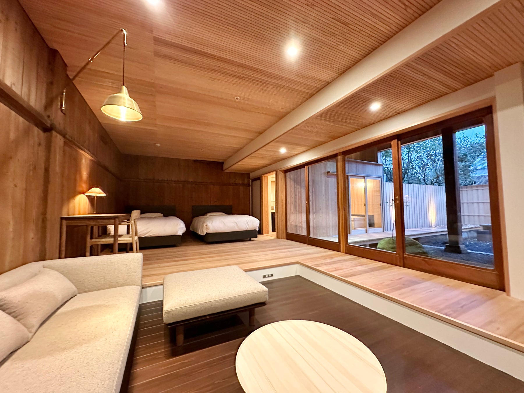 半露天の檜風呂や、美しい庭園を眺めることのできる縁側など、上質な空間でリラックスしてお過ごしください。