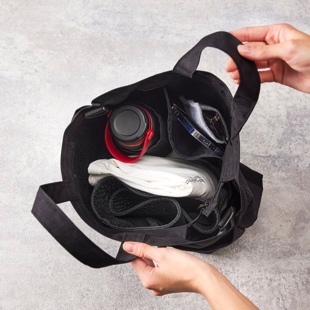 取り外し可能なショルダーが付いたトートバッグ。ポケットやタンブラーホルダーが付いて機能的なので、様々なシーンでお使いいただけます。