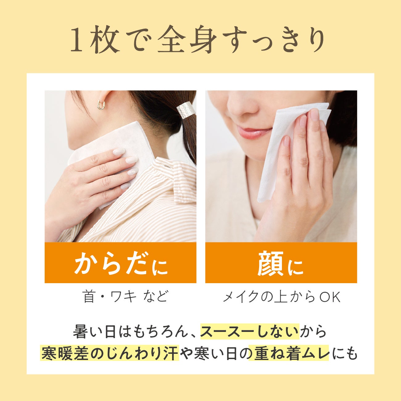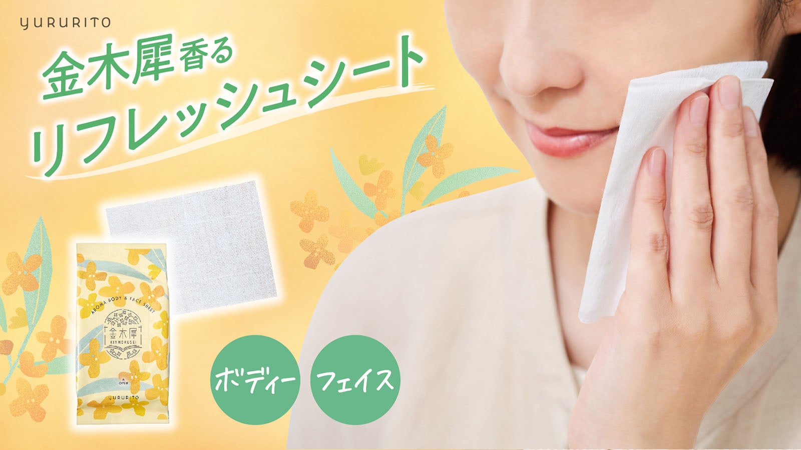 『ゆるりと 金木犀』のリフレッシュシートは、1枚でからだも顔も拭けるボディー&フェイスタイプ。
