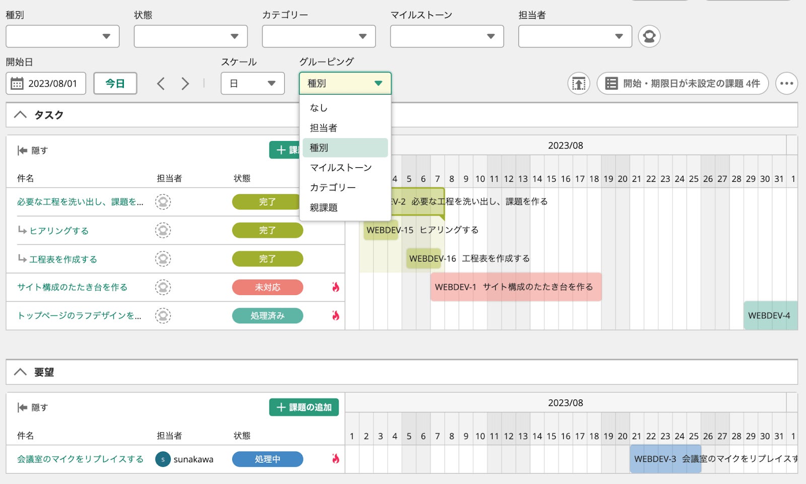 これまで、プロジェクトのガントチャート画面では、「担当者」や「マイルストーン」等で課題をグルーピングすることができました。今回の機能改善では、課題の「種別」も選択できるようになりました。
