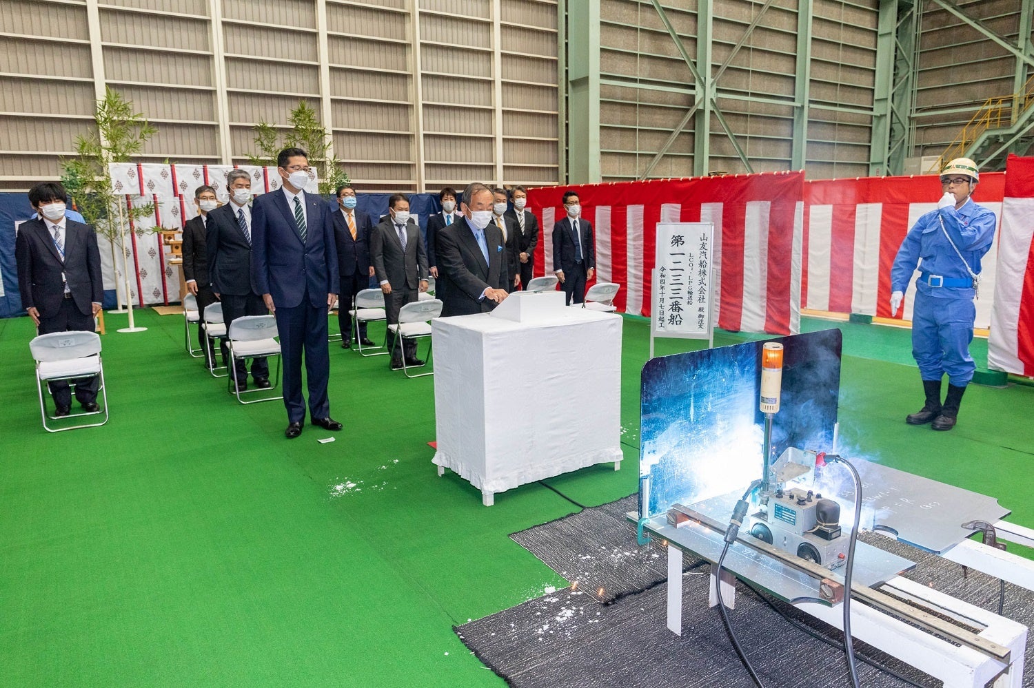 起工式には山友汽船、日本ガスライン、川崎汽船が参加し、工期中の安全と無事の竣工を祈願しました。本船は今後、進水、艤装工事、試運転を経て2023年度後半に、CCUS (Carbon dioxide Capture, Utilization and Storage)を目的としたLCO2輸送船として引き渡される予定です。