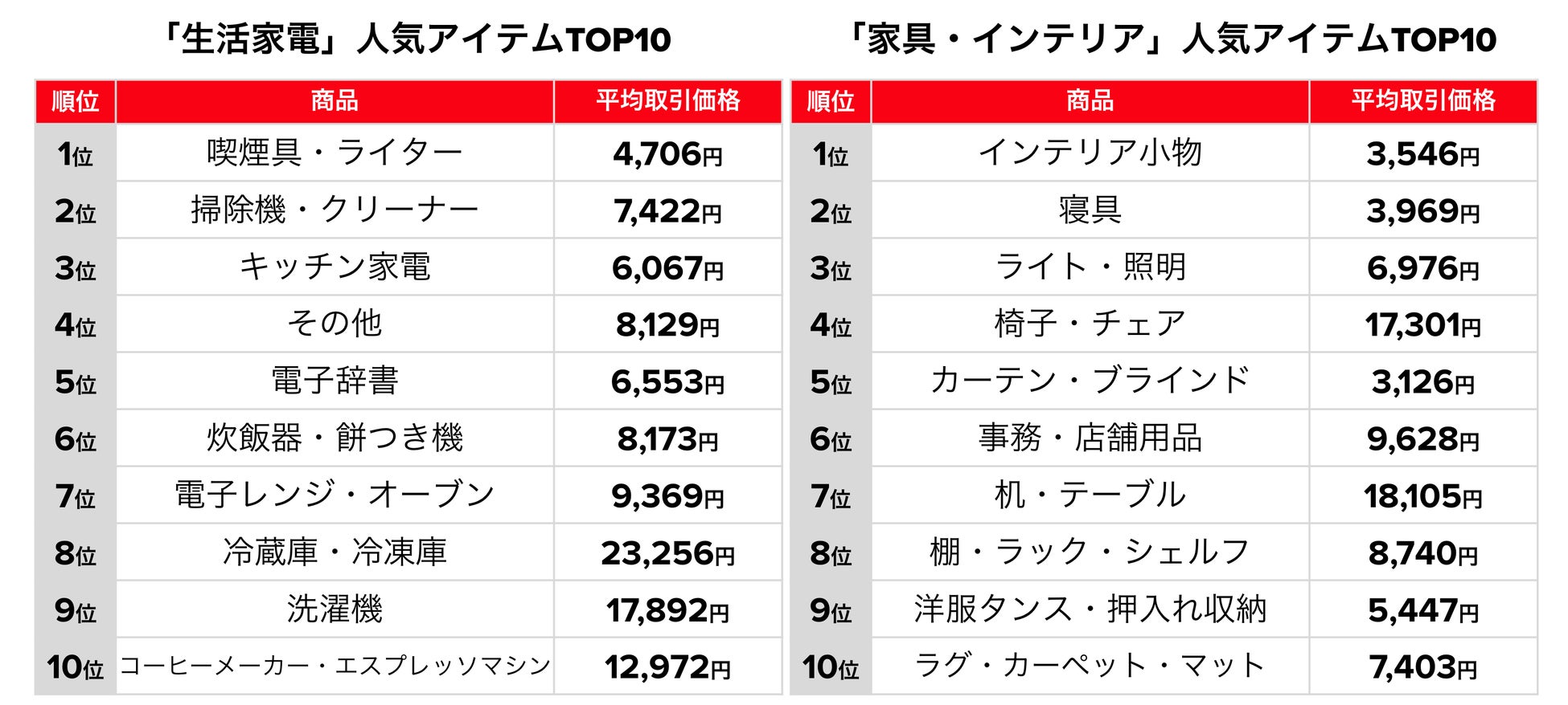 2025年4月中に「メルカリ」で取引された「生活家電」と「家具・インテリア」カテゴリーの商品をもとに、人気アイテムをランキング形式でまとめました。新生活に役立つお得なアイテムの参考情報として、平均取引価格とあわせてご紹介します。