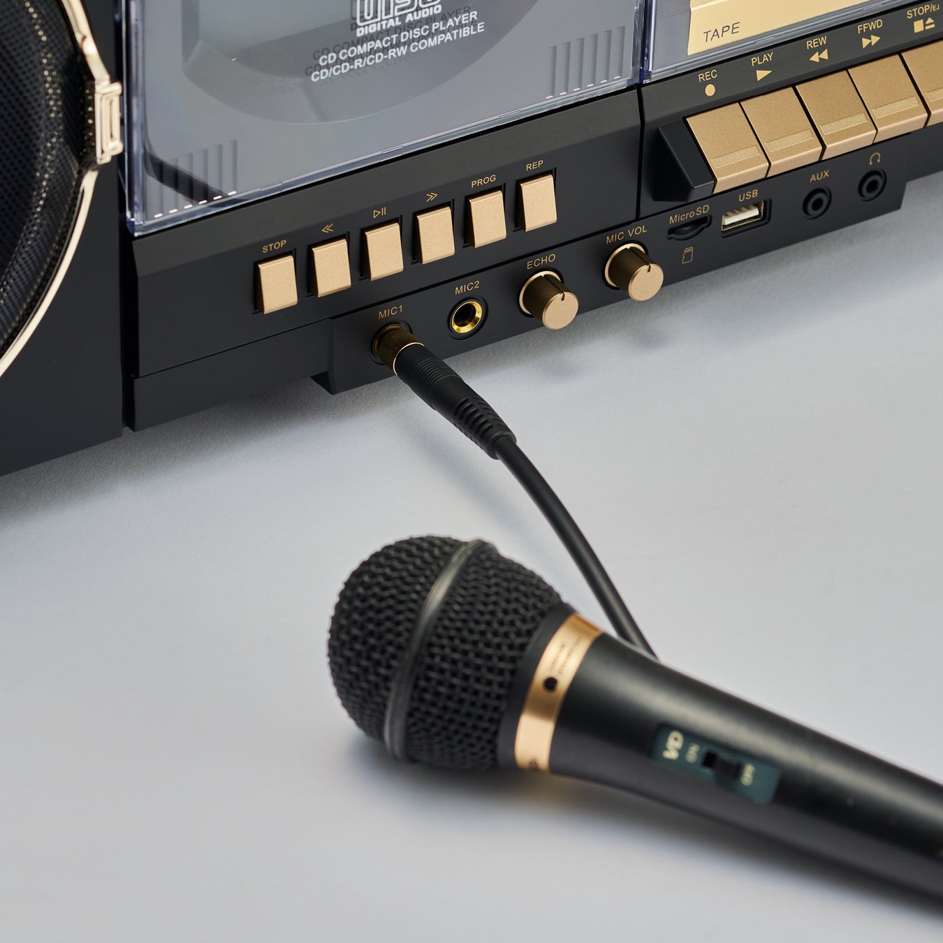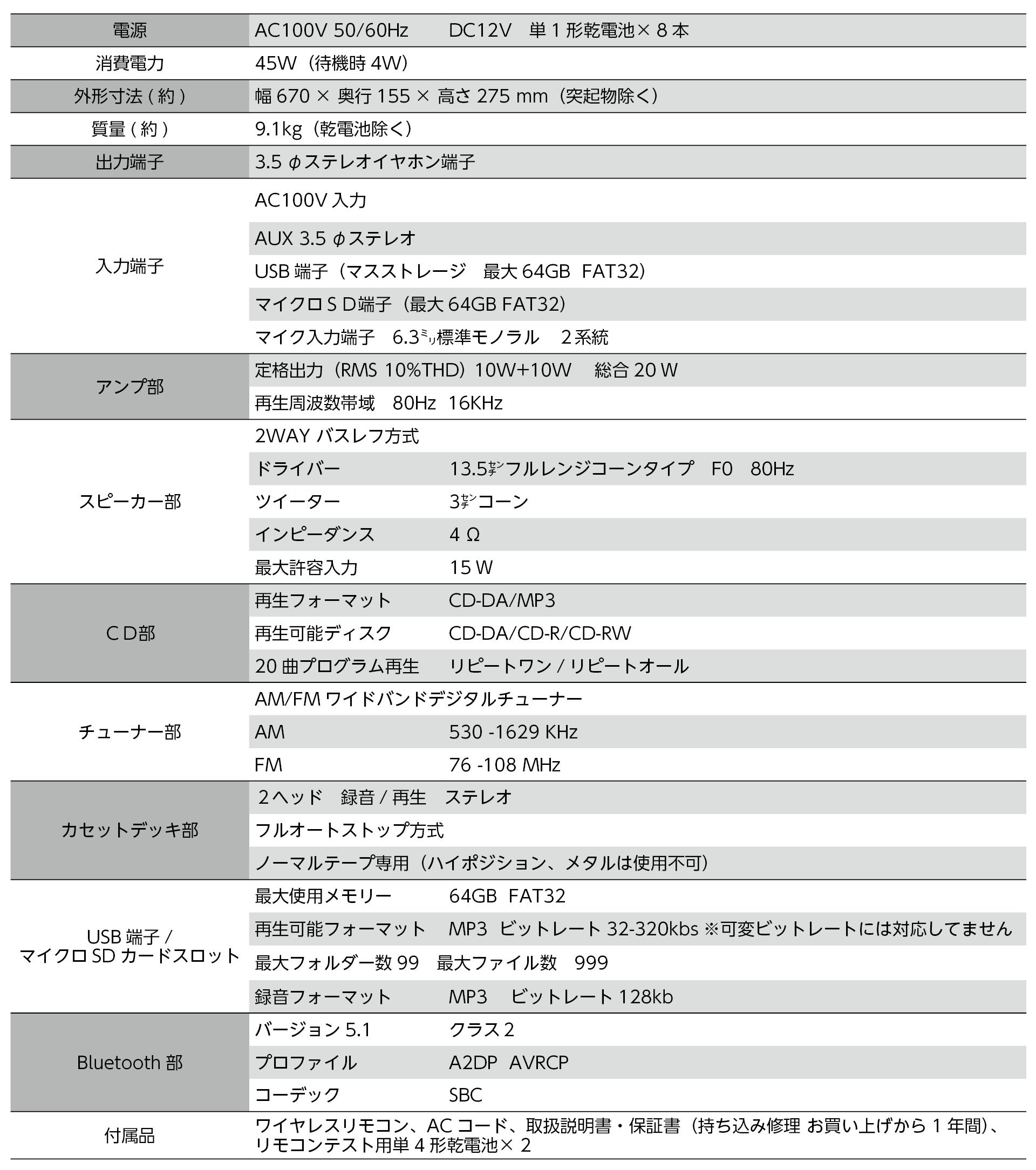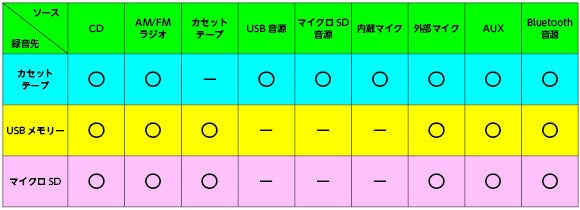 ・カセットテープへの録音可能ソース:CD/ラジオ/BT接続/USB/microSD/AUX(有線)/内蔵マイク/外部マイク入力