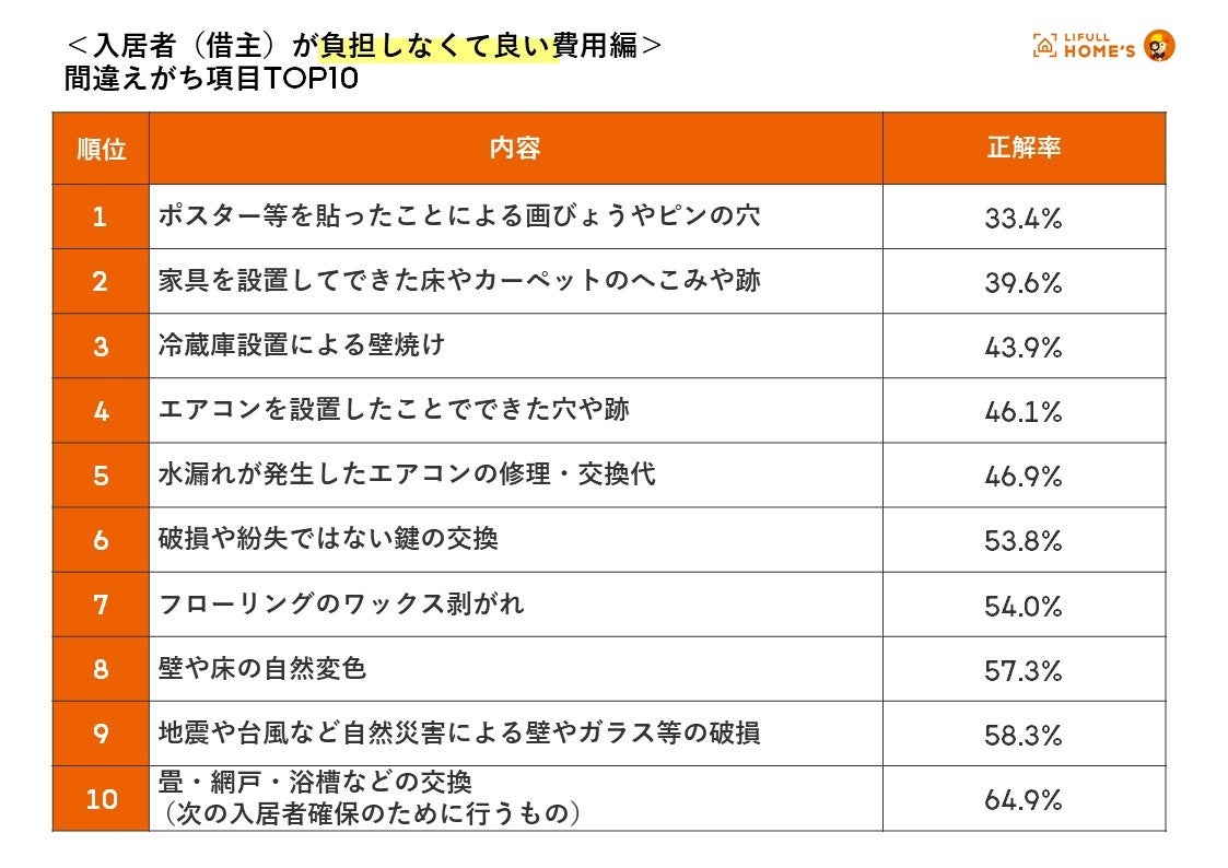 賃貸物件からの引越し経験者1,075人に聞いた『この退去費用は入居者負担?間違えがち項目ランキング』をLIFULL HOME'Sが発表