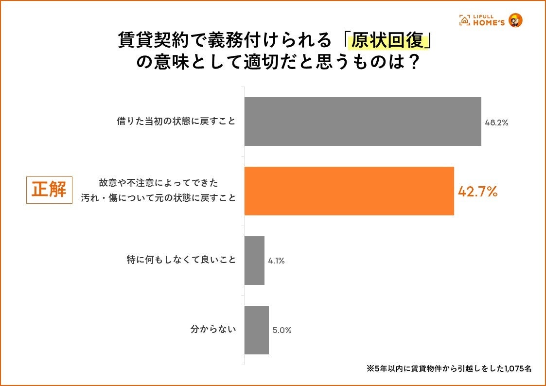 しかしながら「原状回復」という言葉の意味について、最も考えに近いものを選んでもらったところ、最も多かった回答が「借りた当初の状態に戻すこと」(48.2%)で、正しい理解をしている人は42.7%と半数にも届きませんでした。