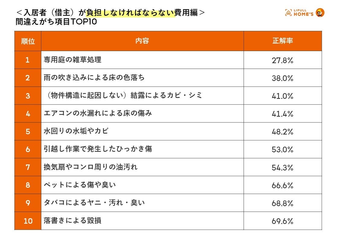 続いて、入居者が負担しなければならない(借主負担とされる)各項目について、正解率(「借主負担」と回答した割合)が最も低かったのは「専用庭の雑草処理」(正解率27.8%)でした。また、「雨の吹き込みによる床の色落ち」(正解率38.0%)、「(物件構造に起因しない)結露によるカビ・シミ」(正解率41.0%)、「エアコンの水漏れによる床の傷み」(正解率41.4%)、「水回りの水垢やカビ」(48.2%)は正解率が半数を割り込みました。