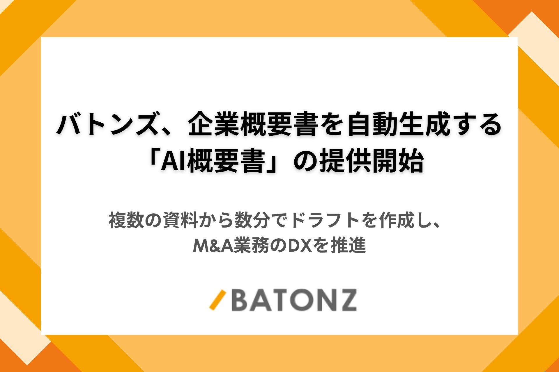 M&A・事業承継支援プラットフォーム「BATONZ(バトンズ)」を運営する株式会社バトンズ(本社:東京都中央区、代表取締役CEO:神瀬 悠一、以下バトンズ)は、M&A専門家向けの新機能「AI概要書」(β版)の提供を2026年4月より開始いたしました。本機能は生成AIを活用し、複数の資料を読み込ませるだけで、企業概要書のドラフトを自動生成するサービスです。