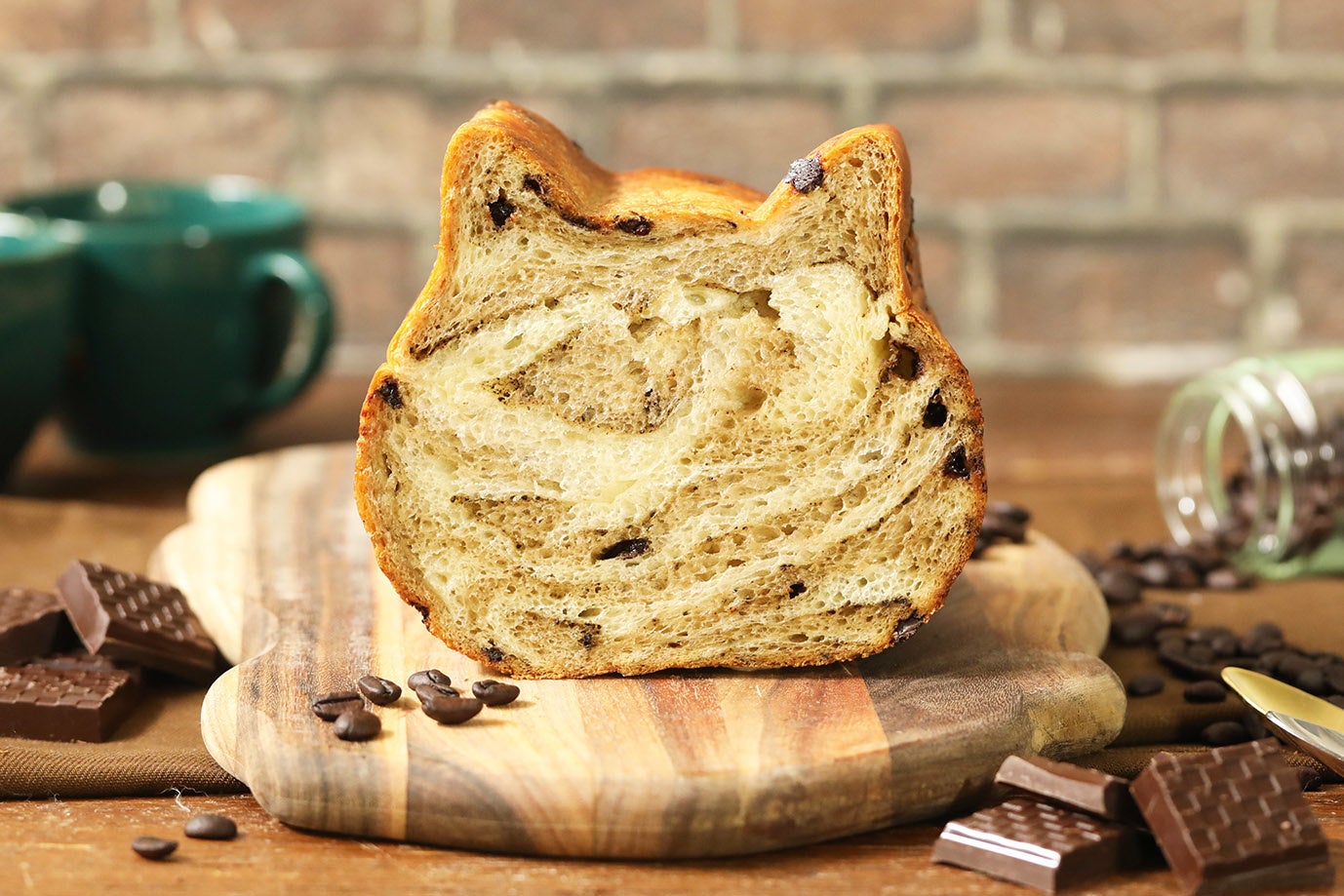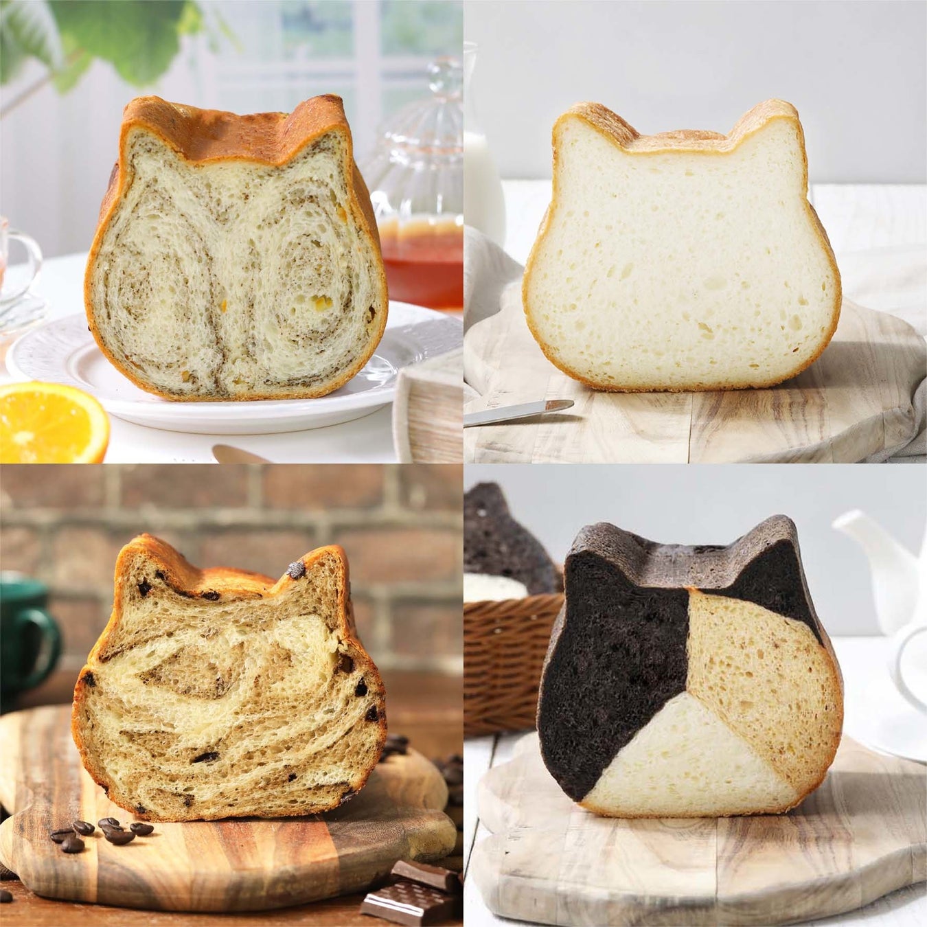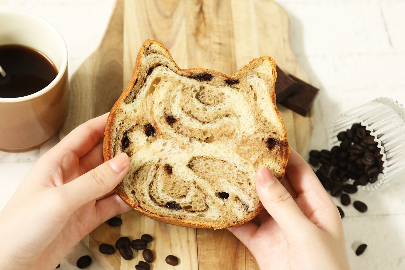 ホワイトチョコが入ったアールグレイ生地と、オレンジピールが入ったプレーン生地を使用し、2種類の味わいをお楽しみいただけるねこねこ食パンに仕上げました。