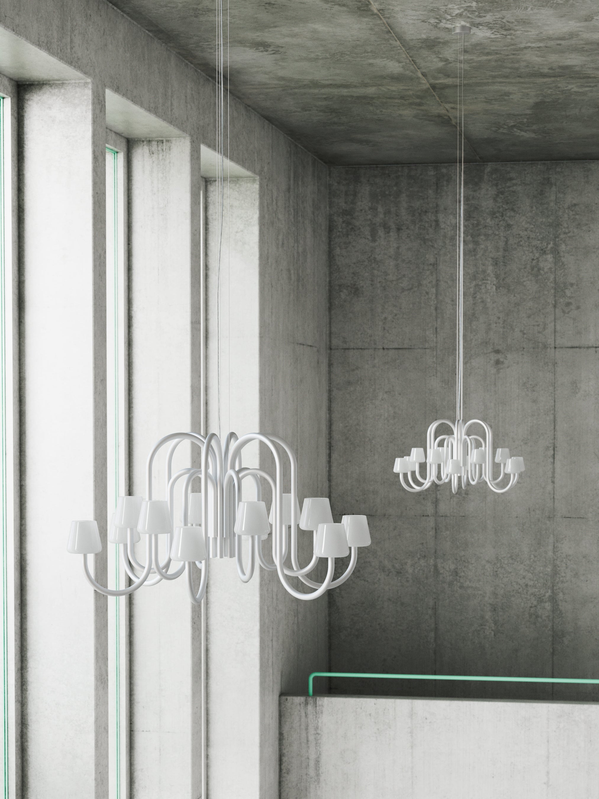 APOLLO LAMP COLLECTIONの続編シリーズ。乳白吹きガラスと工業的なアルマイトのアームが意外性のあるコントラストを作り出し、伝統的なランプを彫刻的かつ機能的に一新しています。エレガントで存在感があり、プライベート空間でも公共施設でもシーンを選ばず活躍します。