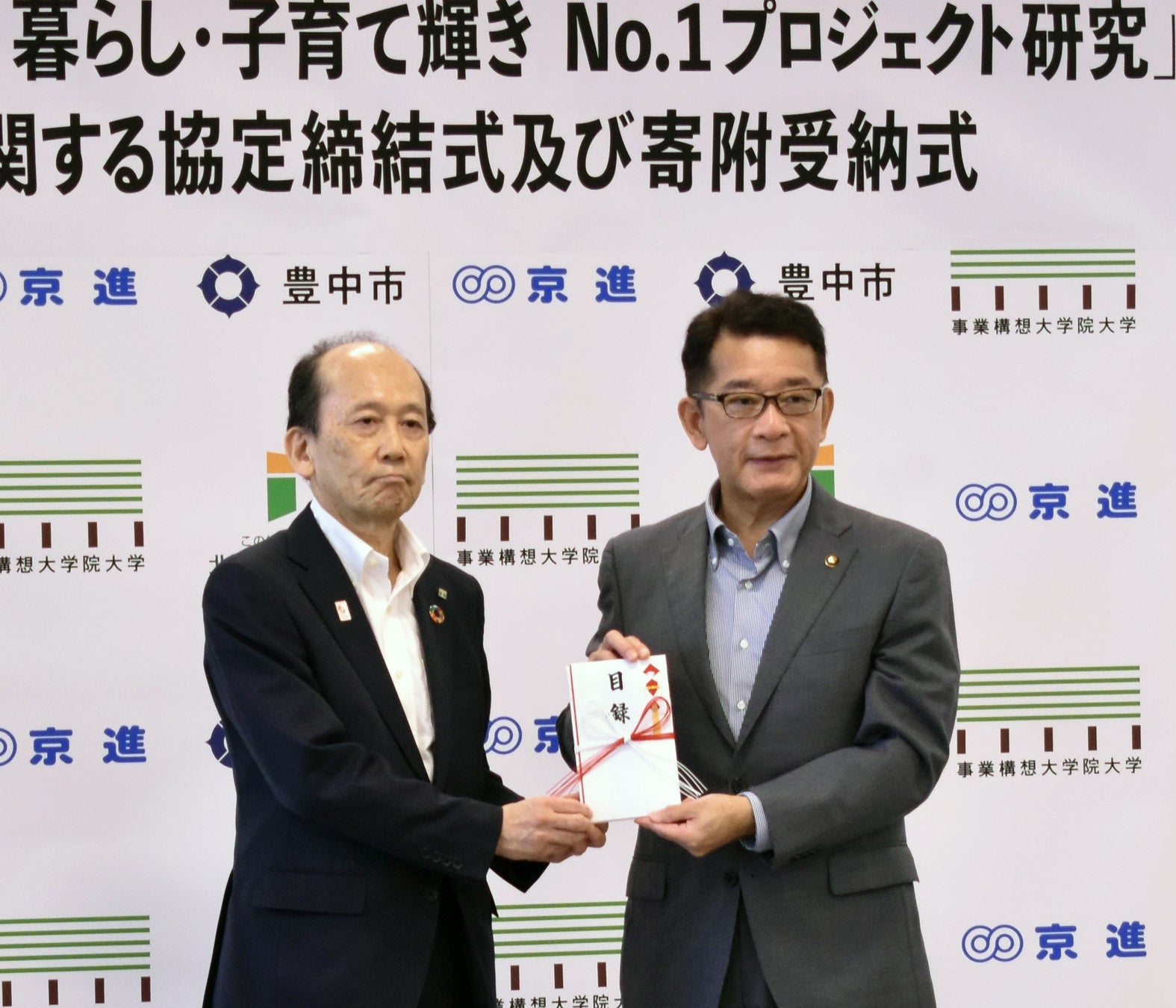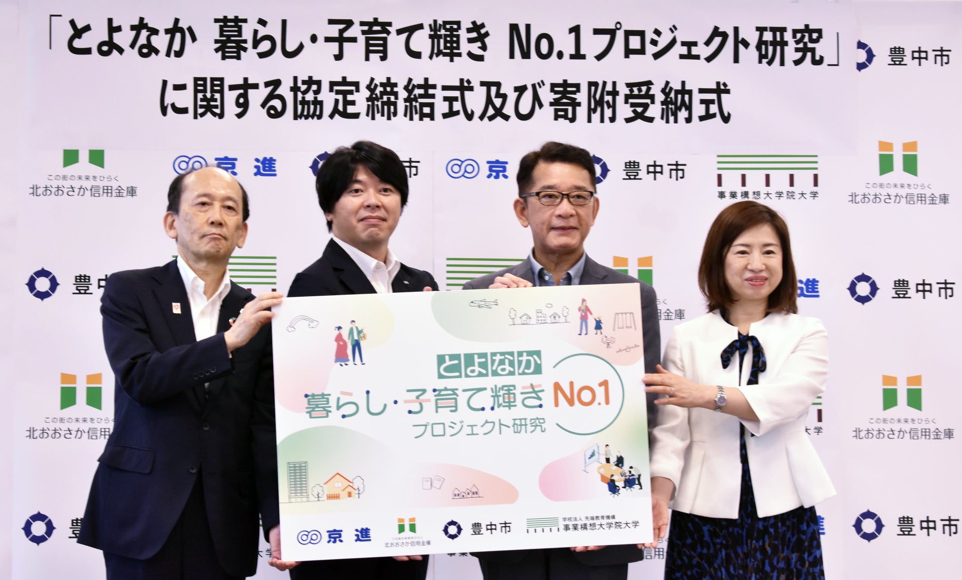 豊中市(市長:長内繁樹)、株式会社京進(本社:京都府京都市、代表取締役社長 立木康之)、北おおさか信用金庫(本店:大阪府茨木市、理事長 須戸裕治)、学校法人先端教育機構 事業構想大学院大学(本部:東京都港区 学長:田中里沙)の4者は、豊中市域の地域創生を目的とした連携協定を、2024年7月19日付で締結しました。本協定に基づく具体的な取り組みとして「とよなか 暮らし・子育て輝き No.1プロジェクト研究」を発足し、2024年9月開始に向けてプロジェクト研究員を募集します。