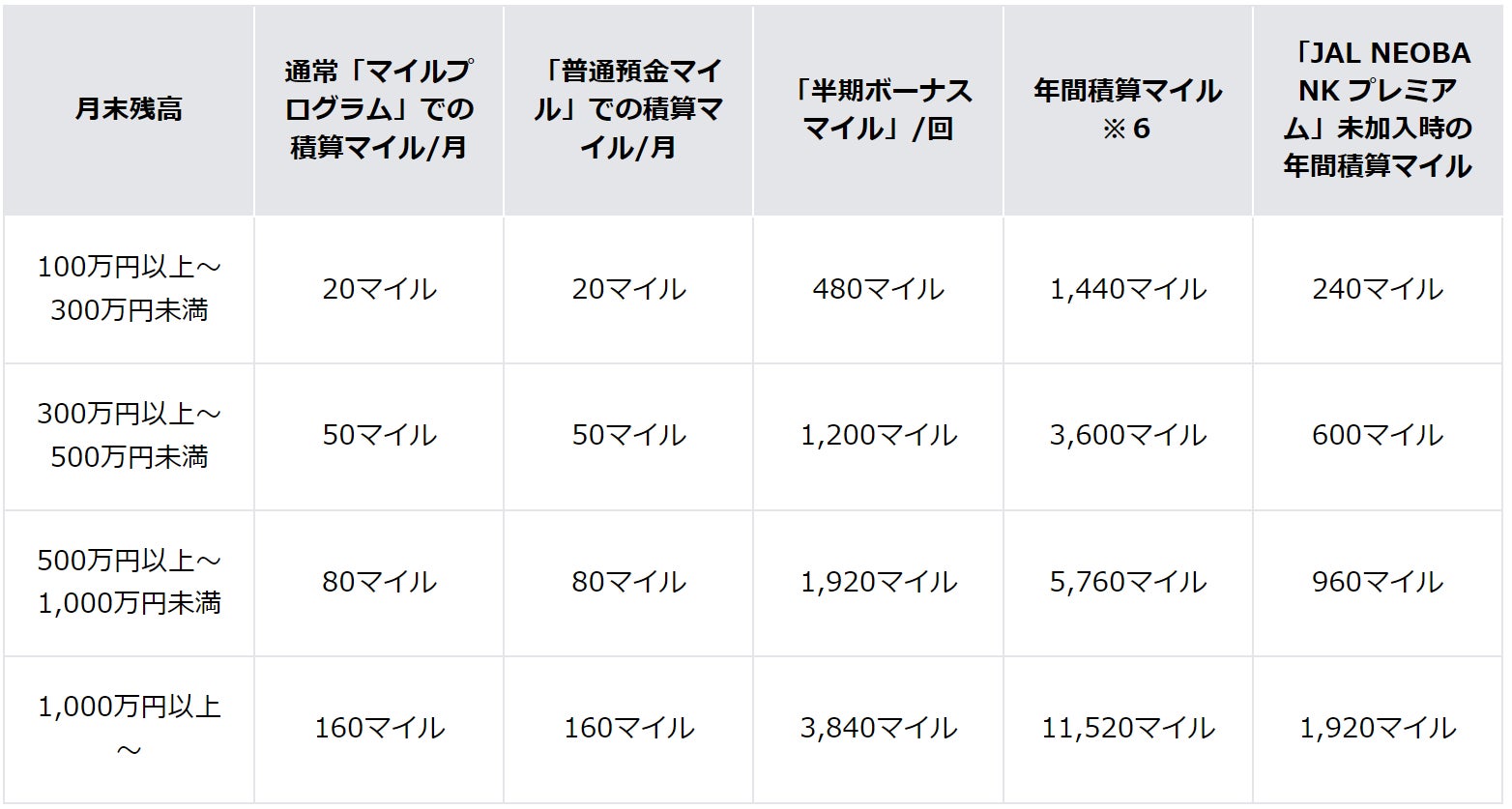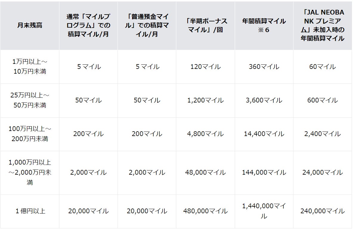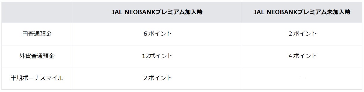 通常「マイルプログラム」でたまる毎月の積算マイルに加え、「JAL NEOBANKプレミアム」では円普通預金・外貨普通預金の月末残高に応じて、さらに「普通預金マイル」としてマイルが加算され、未加入の場合の2倍のマイルがたまります。
