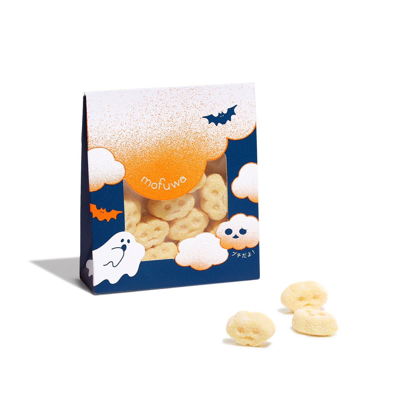 グミッツェルの新しい家族として誕生した「mofuwa(モフワ)」は“もふふわ食感”が特徴のなんとも言えない癒し系のマシュマロです。通年販売しているmofuwaプチはヨーグルト味ですが、ハロウィン限定商品ではみかんソーダ味です。おばけがあしらわれたパッケージの窓からかわいらしいマシュマロがのぞきます。手に取りやすいサイズ感でお手頃価格なので、普段お世話になっている家族や友人、職場へのギフトや、出張のお供などにもぴったりな商品です。