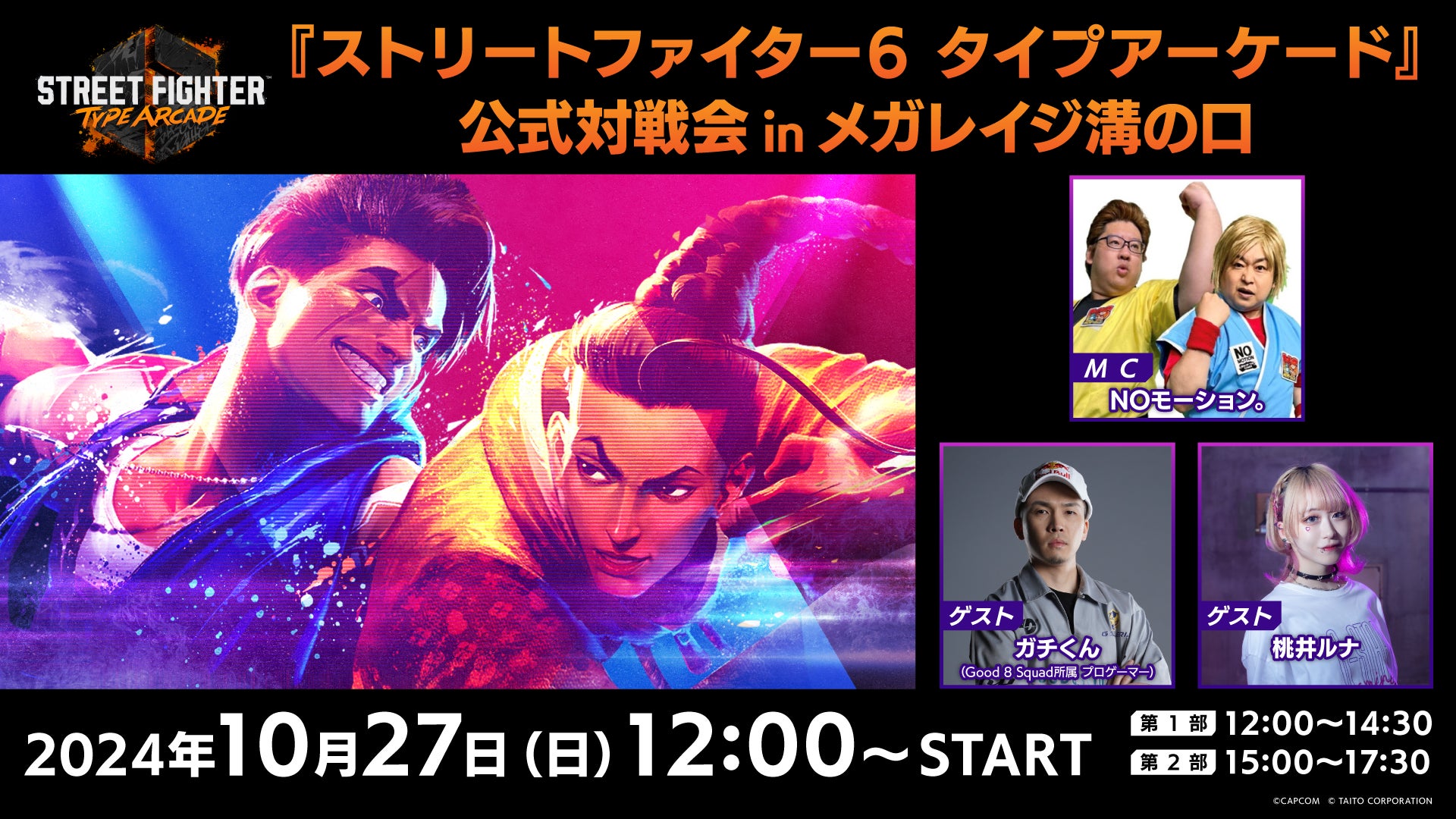 2024年10月27日(日)に、メガレイジ溝の口(タイトーステーション 溝の口店3F)にて、『ストリートファイター6 タイプアーケード』のリアルイベント「公式対戦会 in メガレイジ溝の口」を開催します。ゲストに人気プロゲーマーの「ガチくん」さん、格闘ゲームプレイヤーの「桃井ルナ」さん、MCとして『ストリートファイター』シリーズのものまねでお馴染みの「NOモーション。」さんにご出演いただきます。ご出演の皆さまには「エキシビションマッチ」にもご参加いただく予定です。さらに、出場される皆さまには、「特製ICカードステッカー」のプレゼントもご用意しております。この機会にぜひご参加ください。
