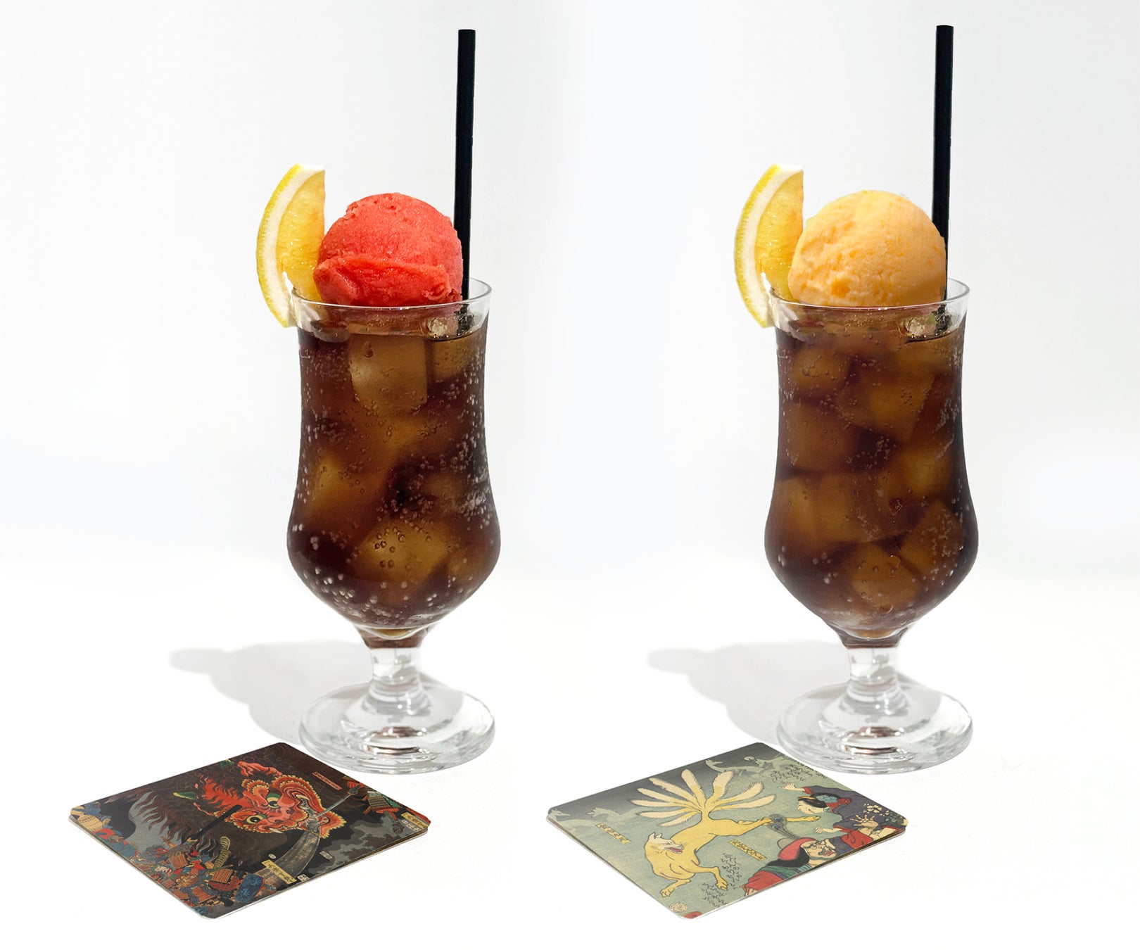 赤鬼と九尾狐、それぞれを表現したフルーツアイスをトッピングした、カラフルなコーラフロートです。