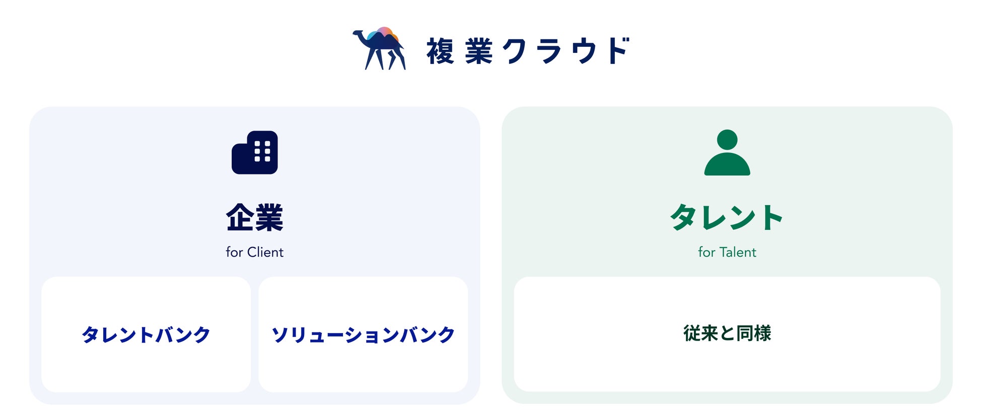 「挑戦する全ての人の機会を最大化する」をビジョンに掲げるスタートアップ企業です。2019年9月に総合型の複業マッチングプラットフォーム「複業クラウド」をリリース。ミッションである「複業の社会実装を実現する」ために、一部上場企業からスタートアップ、自治体、スポーツチーム、教育機関など、業種業界問わずあらゆるドメインで複業人材の登用を後押ししています。また「複業クラウドfor Series」として、自治体向けには複業クラウド for Publicを、スポーツチーム向けには複業クラウド for Sportを、教育機関向けには複業クラウド for Academyを提供しています。