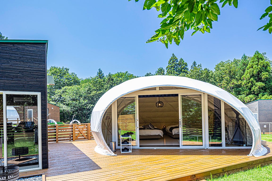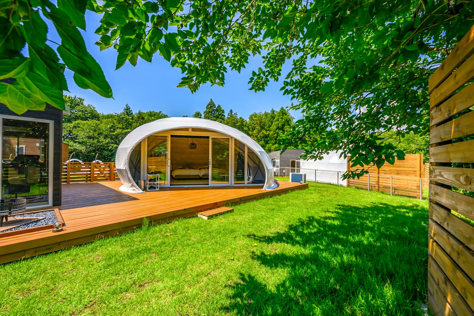 「グランピングB&V 那須高原」は、四季折々の美しい⾃然と温泉に癒される栃⽊県・那須⾼原エリアに、2023年8月にオープンしたグランピング施設です。