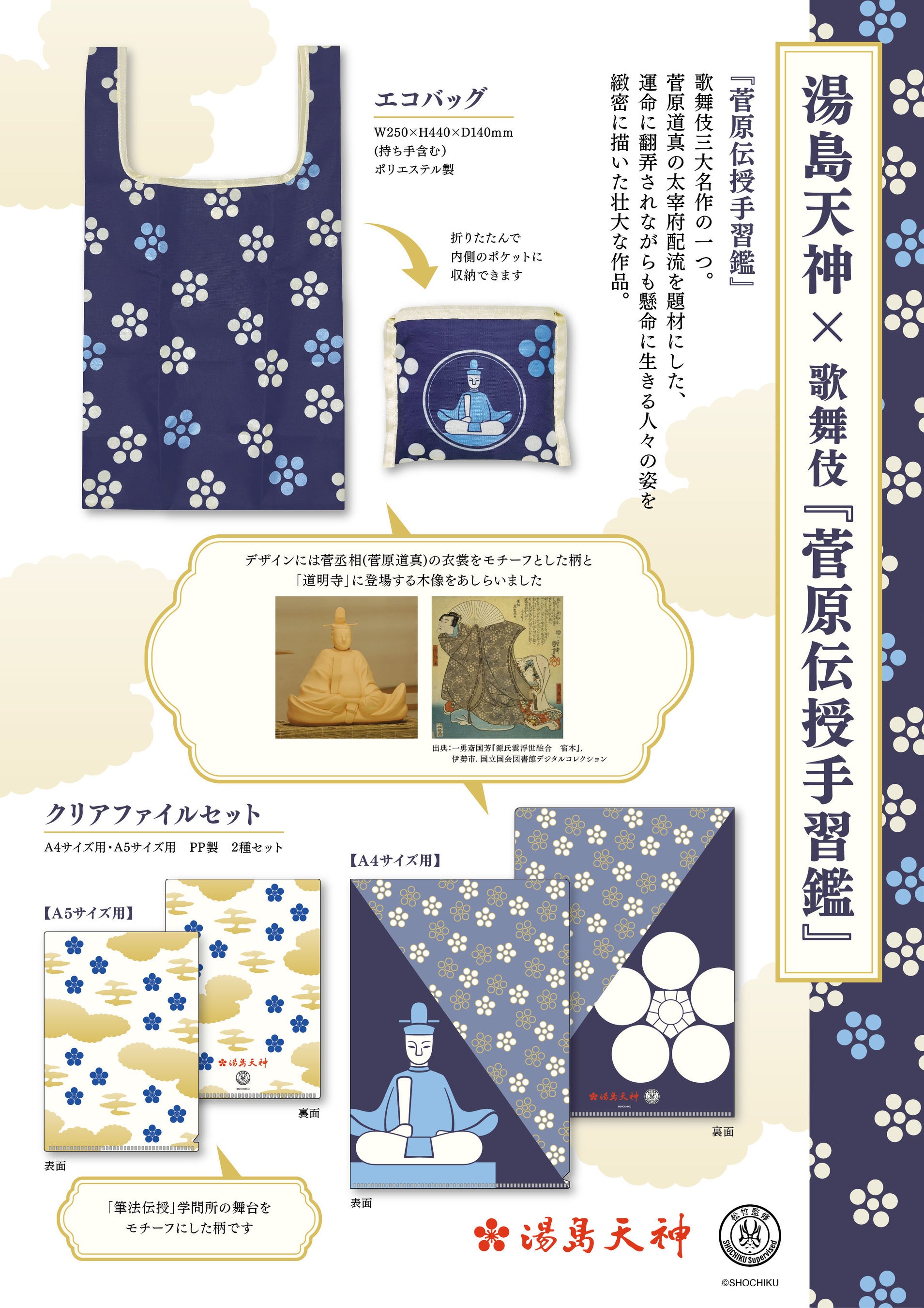 松竹株式会社(東京都中央区築地、代表取締役 髙𣘺 敏弘)事業推進部は、湯島天満宮(東京都文京区湯島)と歌舞伎『菅原伝授手習鑑』がコラボしたデザインのクリアファイルセットとエコバッグを企画いたしました。