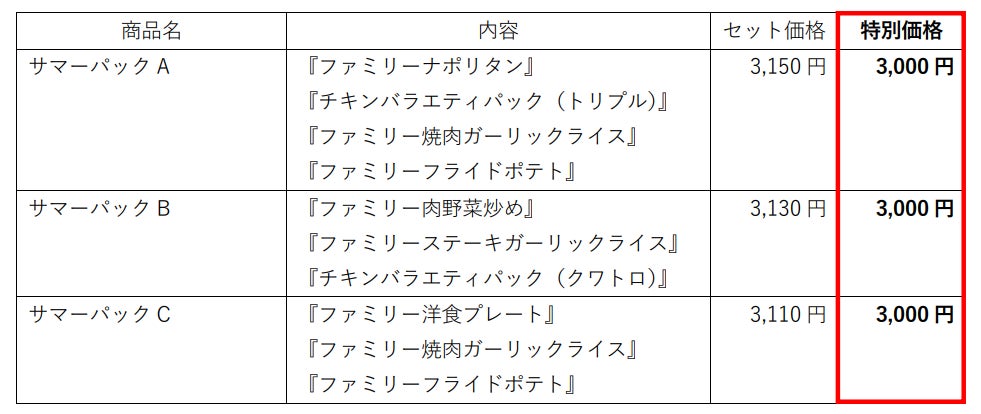 株式会社プレナスは、持ち帰り弁当の「Hotto Motto (ほっともっと)」を、2023年6月末現在、2,452店舗展開しております。このたび「ほっともっと」では、7月19日(水)~8月31日(木)の期間中に、ファミリーメニューやチキンバラエティパックなどを組み合わせたお得なセット『サマーパック(3,000円)』を期間限定販売いたします。3種類のラインナップからお好きなセットがお選びいただけます。最大で150円お得なサマーパック(3,000円)を夏休みの家族の食卓やお出かけなどに、ぜひご利用ください。