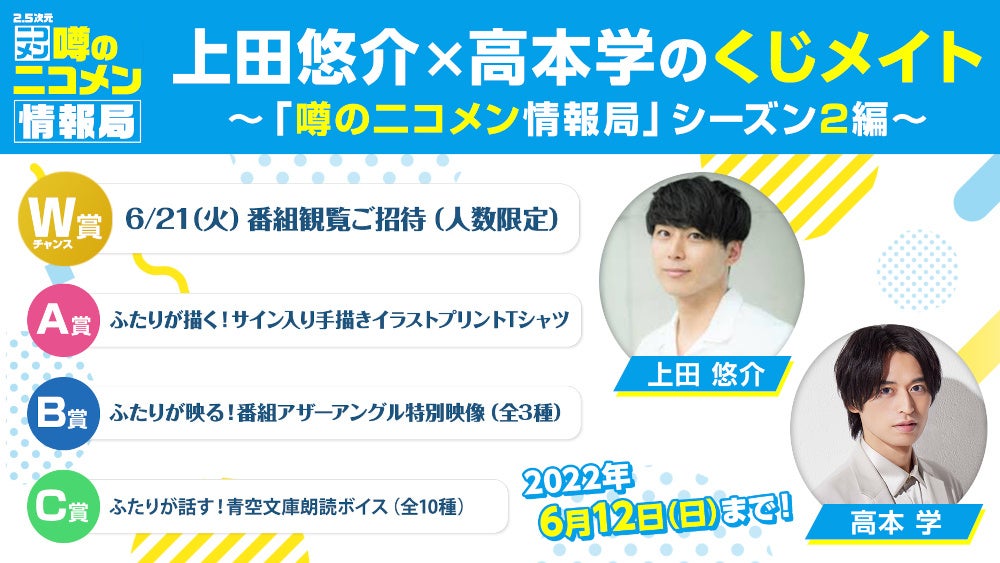 ニコニコ生放送、ニコニコチャンネル「2.5次元 やっぱニコメン」でレギュラー放送中の、舞台・ミュージカル・俳優ジャンルの情報トークバラエティー「噂のニコメン情報局」。毎回旬な俳優をゲストに放送中の本番組で第8回目ゲストとして、上田悠介と高本学(※50音順)の生出演が決定した。放送は6月21日(火)20時30分から。またゲスト発表と同時に、今回だけのアニメイトのオンラインくじ[くじメイト]の販売も発表された。このくじではゲスト二人が描くイラスト入りTシャツ等が当たるほか、条件を満たすと6月21日(火)20時30分からの本番組の観覧に、人数限定20名様を特別招待する豪華な賞品も!尚、くじ販売は6月6日(月)から6月12日(日)までの期間限定となっている。このレアなプレゼントが当たるこの企画に、ぜひ参加いただきたい。
