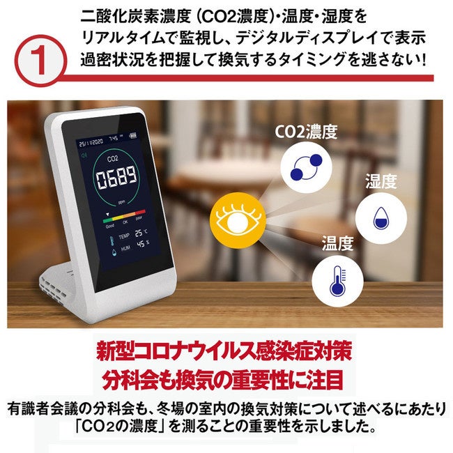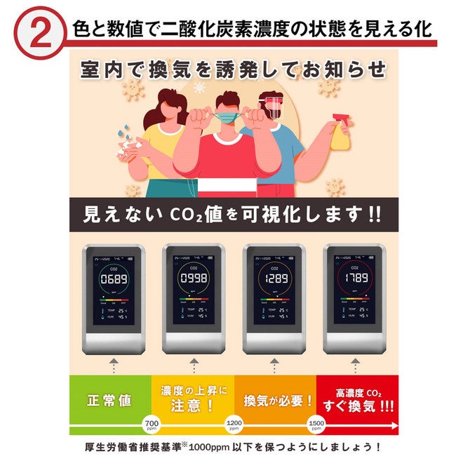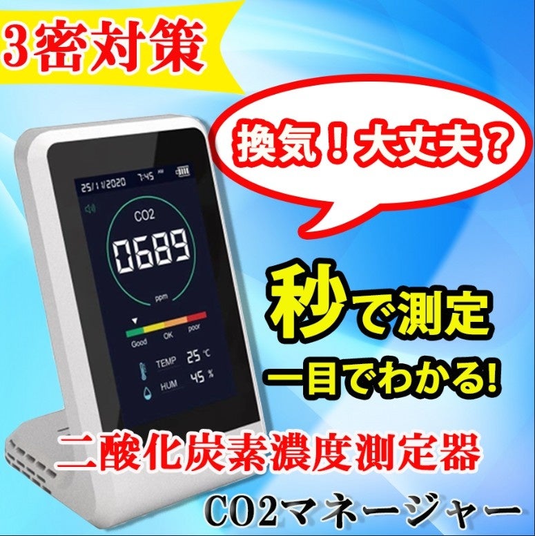 まん延防止は出来てますか?換気のタイミングが一目で分かる便利なコンパクトサイズの二酸化炭素濃度計「CO2マネージャー」です。
