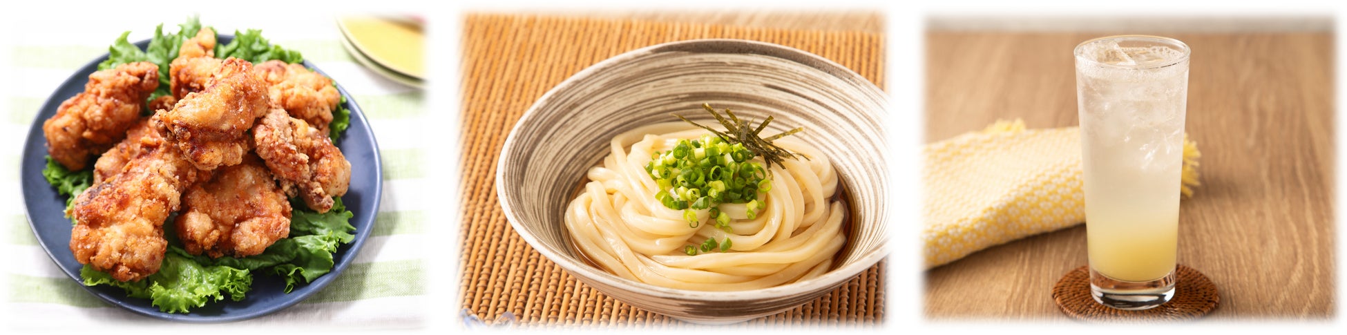 ドリンクとしては炭酸やお茶、アルコールや牛乳などのお好みの割り材で割ってお楽しみいただけ、料理ではうどん、焼き魚、ヨーグルト、サラダ、唐揚げ、ラーメン、パスタなど様々なメニューに最適です。