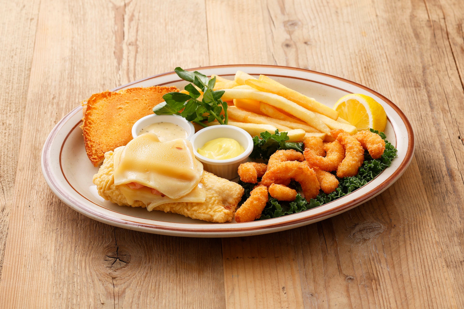衣をつけてフライしたみつせ鶏にハムとラクレットチーズをのせた「マリブチキン」と、サクサクとした食感に後味がほんのり スパイシーなポップコーンシュリンプのコンビネーションです。