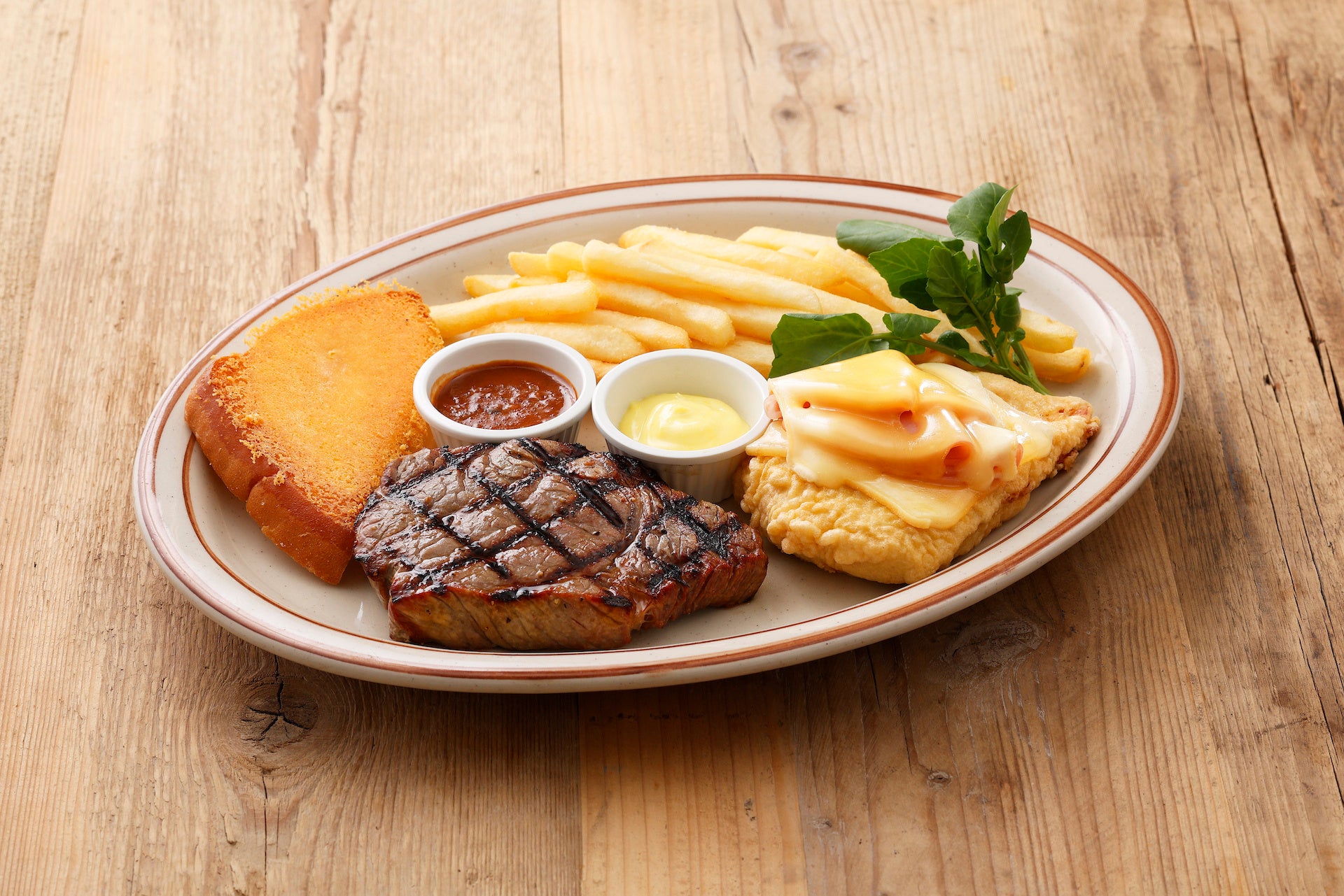 衣をつけてフライしたみつせ鶏にハムとラクレットチーズをのせた「マリブチキン」と、リブロースステーキ150g。