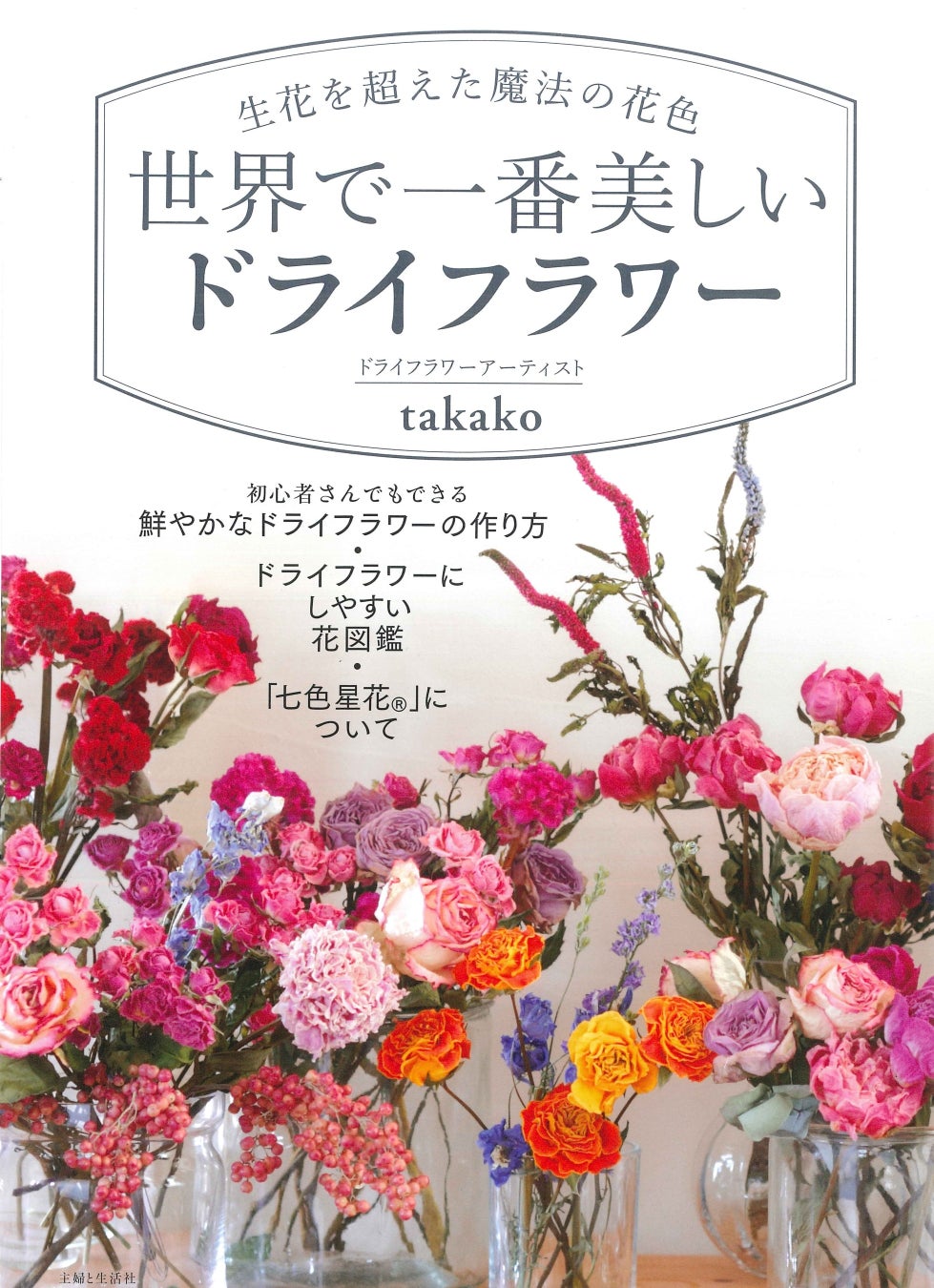 これまでにない鮮やかな発色で、美しいドライフラワーを作る独自の技術を編み出した、ドライフラワーアーティストtakakoさんの初の著書。