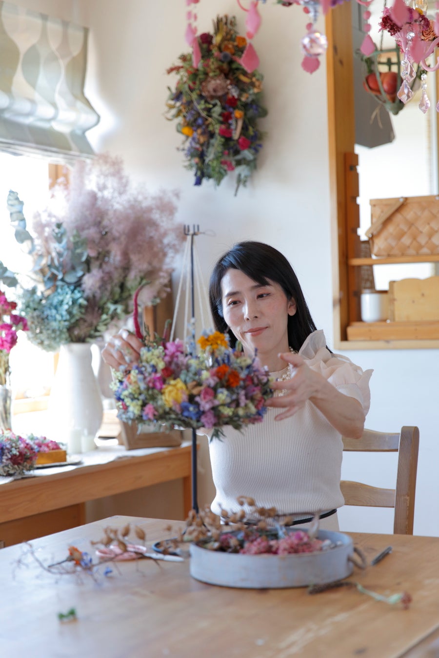 「ドライフラワーに変化した花が再び輝いていく様は、まるで女性のようだな、と。そこにシワがあっても傷があっても、あたたかみと深みを増した美しさがあると、私は思っています。ドライフラワー作りというのは、花の第二の人生のお手伝い。そこに愛情と手間ひまをかけることで、よりいっそう輝いてくれる。私たちの人生も、きっと同じだと思うんです」(ドライフラワーアーティストtakako)