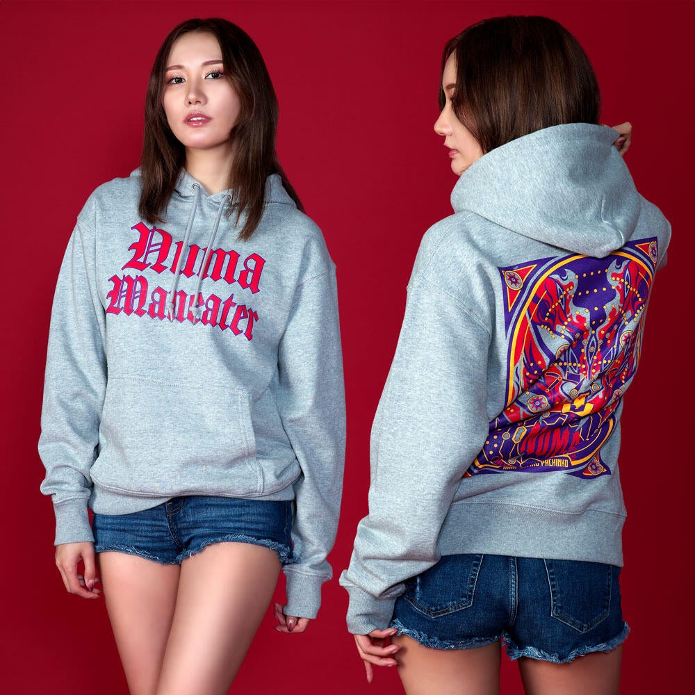 1玉4000円の超高額パチンコ『人食い沼』がパーカーになって登場!背面には魔性のパチンコ台の形相を、胸元には「NUMA MAN EATER」の文字が恐ろしくサグいロゴでプリント!これを着て缶ビール片手にパチンコ屋へ入れば、ゴト疑い間違なし!