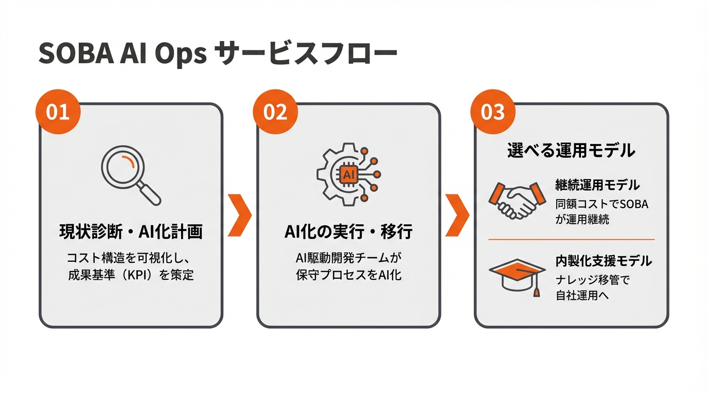 『SOBA AI Ops』は、SOBAプロジェクトが2025年12月に発足した『AI駆動開発チーム』の技術力とノウハウを基盤に、既存システムの保守運用プロセスをAI化し、同一コストのまま保守運用の成果を大幅に向上させるサービスです。