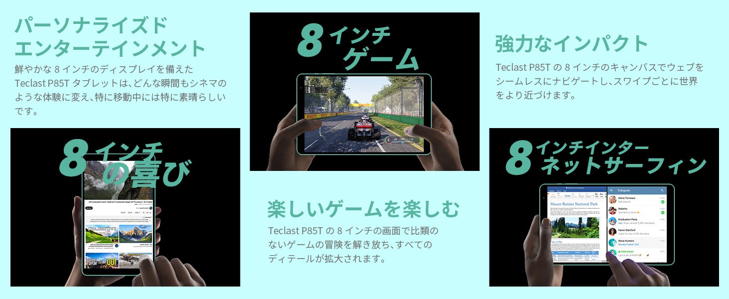 Teclast「P85T」の広い視野角と1280×800の高解像度を備えた8インチIPSスクリーンの輝きを体験してください。画面の細部と消費電力の完璧なバランスを実現し、長時間の視聴セッションを可能にします。T-Colourテクノロジーを搭載し、鮮やかな色彩と向上したディスプレイの詳細を楽しんで、現実的で魅力的なオーディオビジュアルエンターテインメントに没頭できます。
