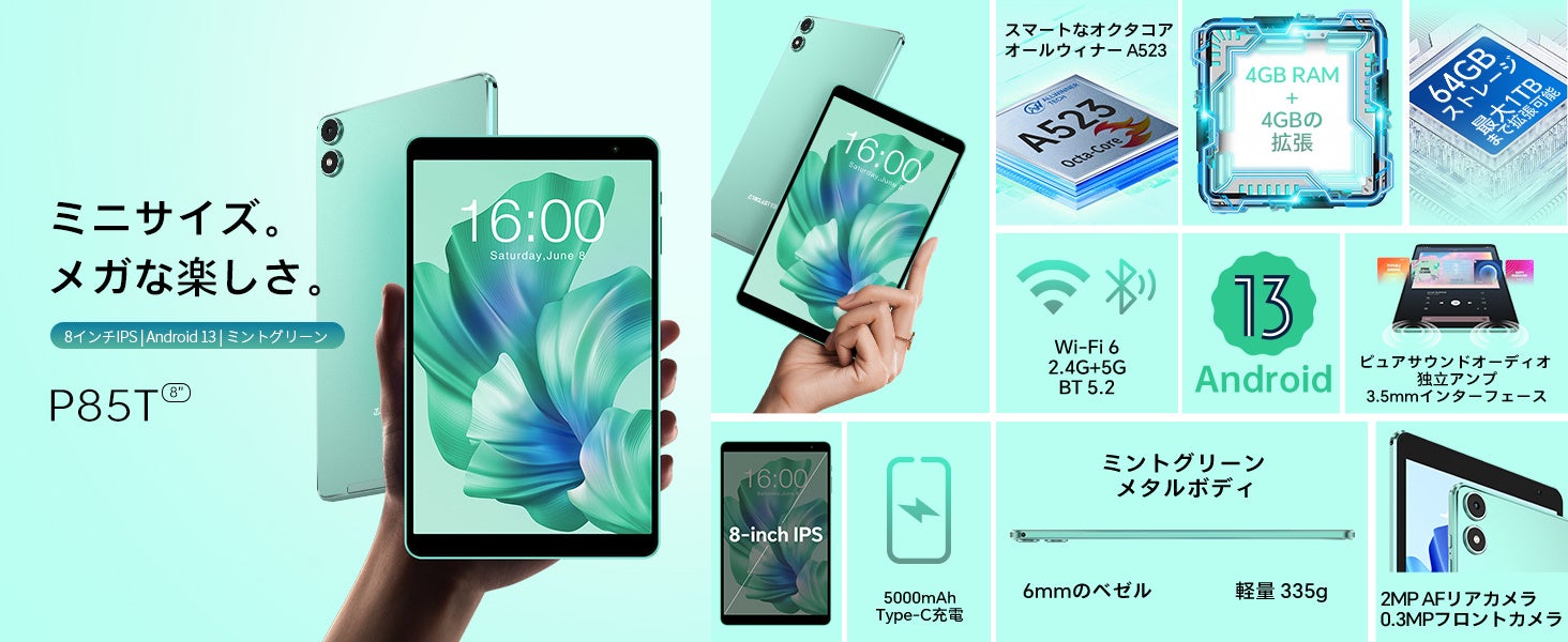 8インチ / Android 13 / 8GB+64GB+1TB TF拡張 / WiFiモデル / Widevine L1対応 / 3.5mmヘッドホンジャック