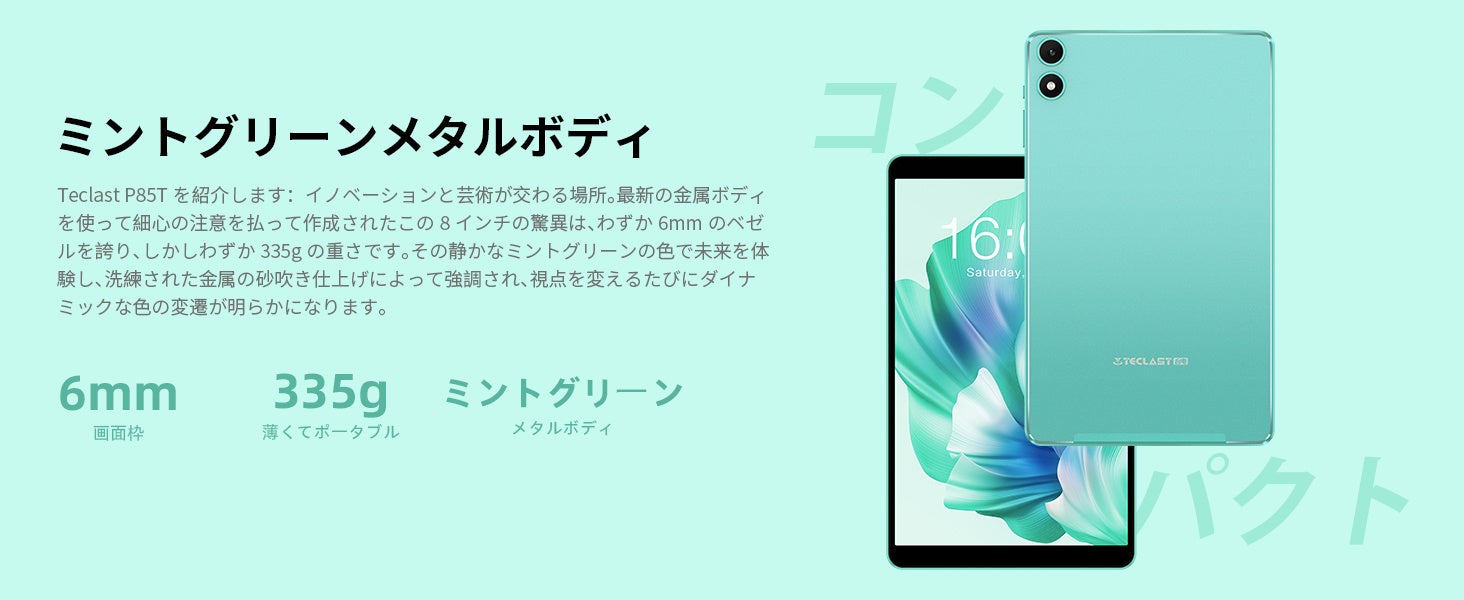 最新の金属ボディを使って細心の注意を払って作成されたこの8インチの製品は、わずか6mmのベゼルを誇り、重さは335gだけです。その静かなミントグリーンの色で未来を体験し、洗練された金属の砂吹き仕上げによって強調され、視点を変えるたびにダイナミックな色の変遷が明らかになります。2MP Alデュアルカメラシステムと補助フラッシュライトと調和して、例外的な明瞭さと輝きで素晴らしい瞬間を簡単に捉えるのに役立ちます。