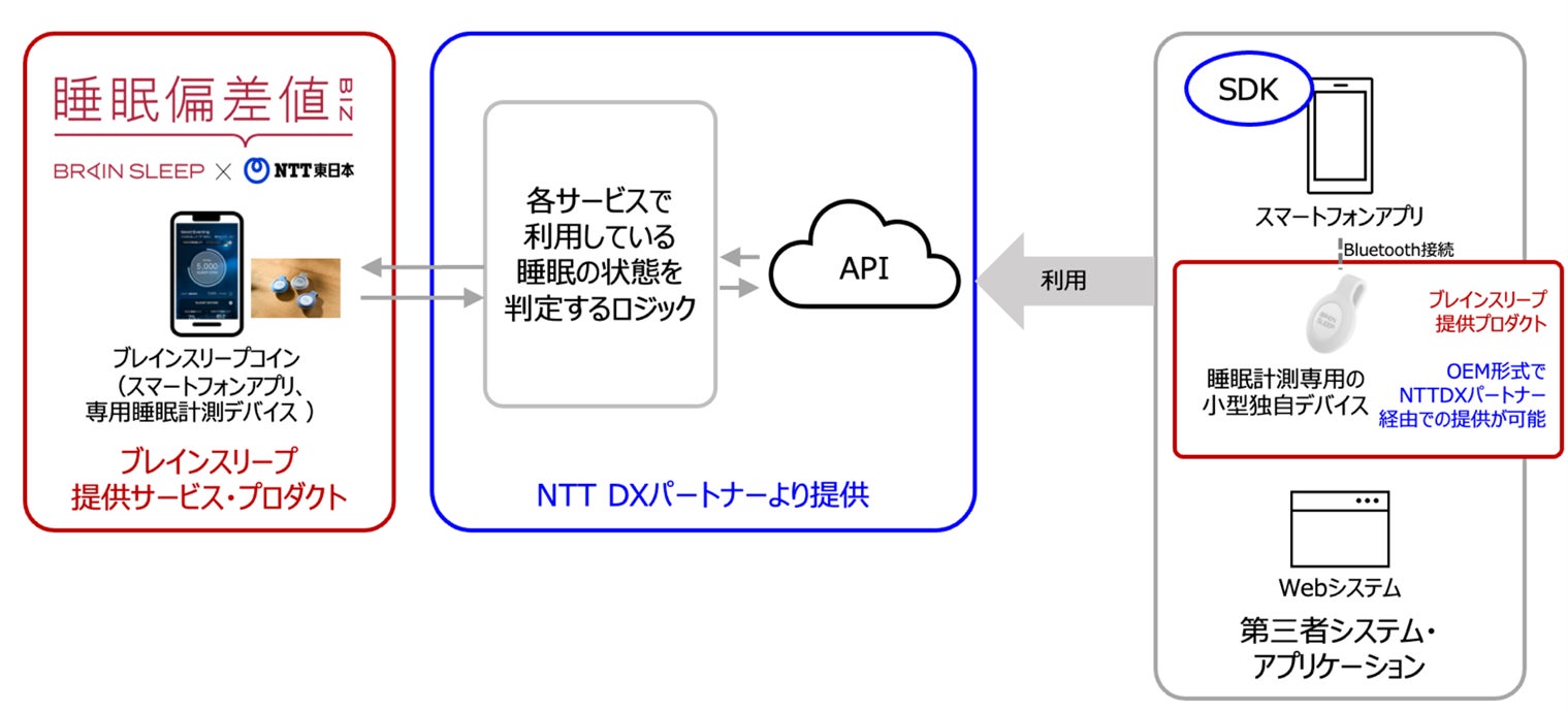 ブレインスリープが提供している「睡眠偏差値for Biz」や「ブレインスリープ コイン」にて利用されている睡眠の状態を判定するロジックを、NTT DXパートナーが第三者システムやアプリケーションに組み込みが容易なAPIとSDKという形で提供するとともに、睡眠計測専用の独自小型デバイスをOEM形式で提供いたします。