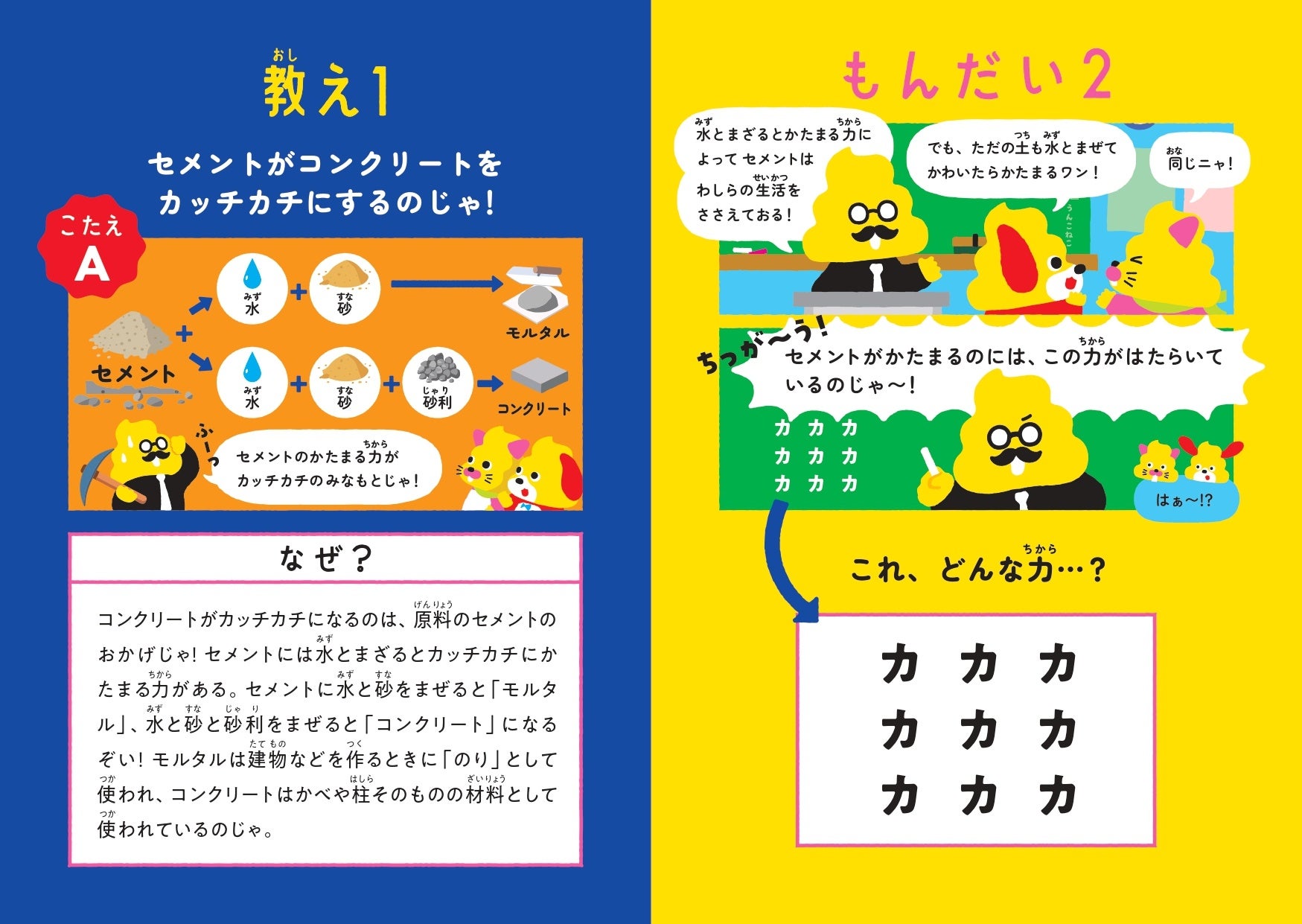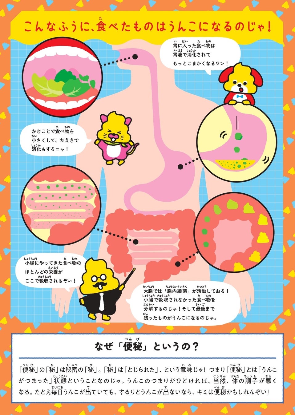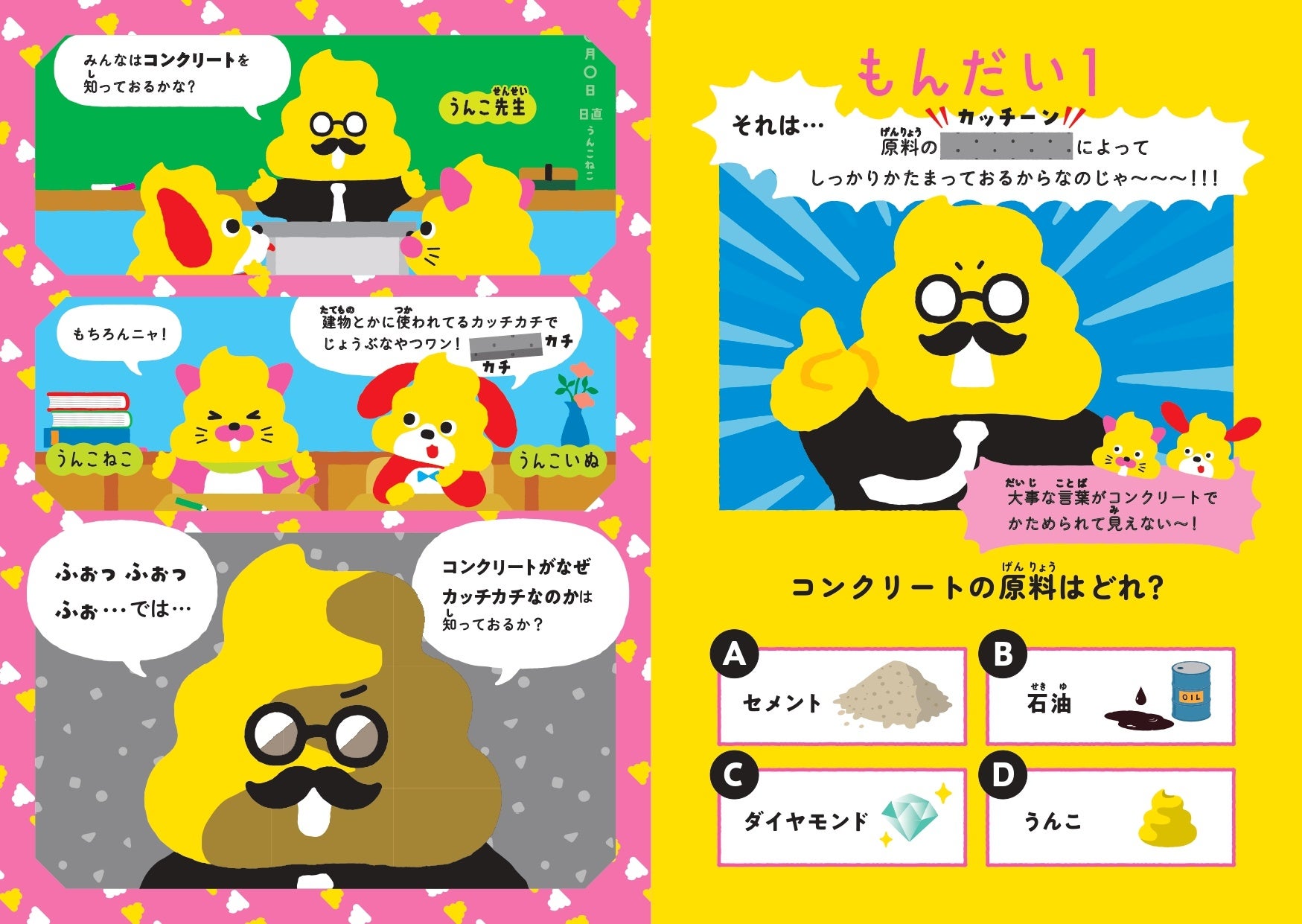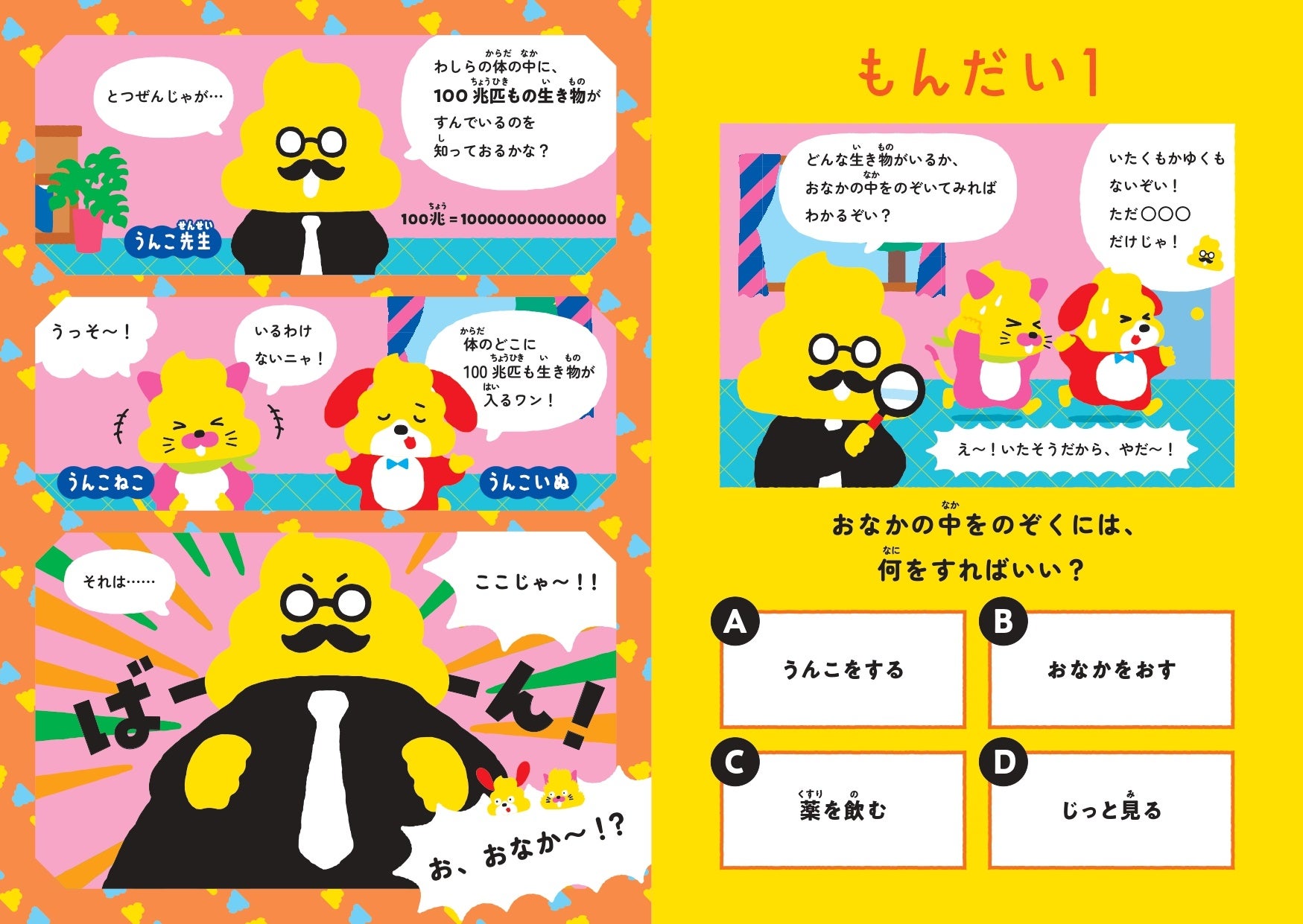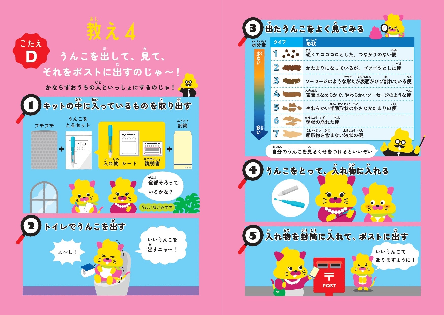 本冊子では、うんこ先生、うんこねこ、うんこいぬが登場し、