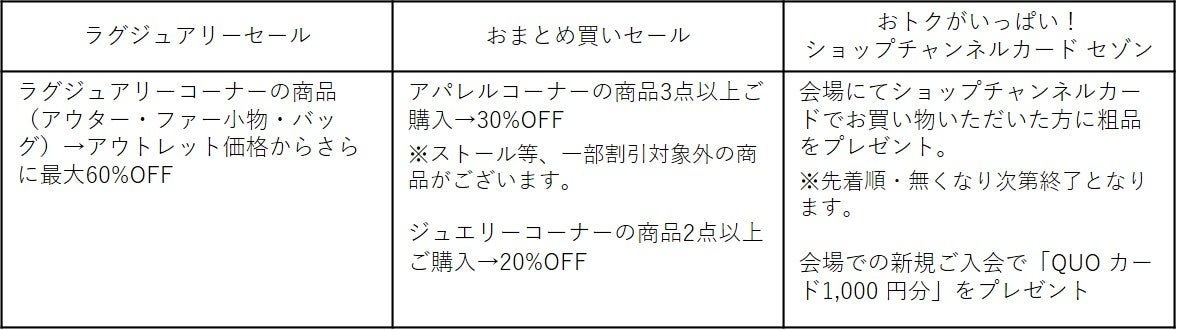 ショップチャンネルのテレビで紹介した商品のアウトレット品や少々訳あり品を、特別価格にてご提供します。商品を直接見て、触ってお選びいただけるチャンスです。ぜひこの機会にご来場ください。