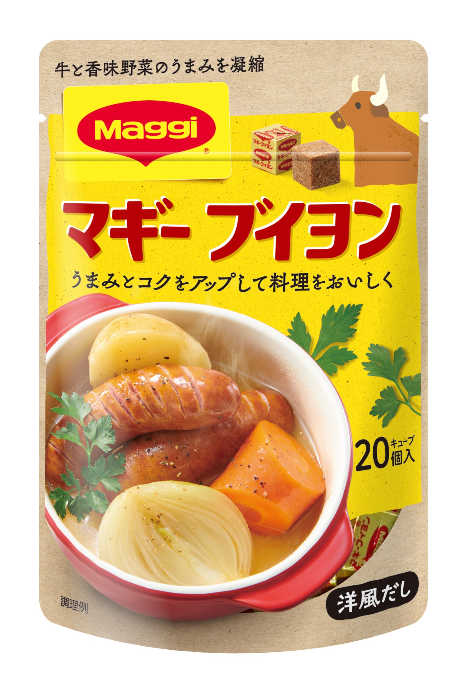この度、「マギー コンソメ 無添加」のリニューアルにあわせて、代表製品である「マギー ブイヨン」のパッケージも刷新します。新しいパッケージには、「マギー ブイヨン」が得意とする“煮込み”料理の代表である「ポトフ」の写真を大きく掲載しています。