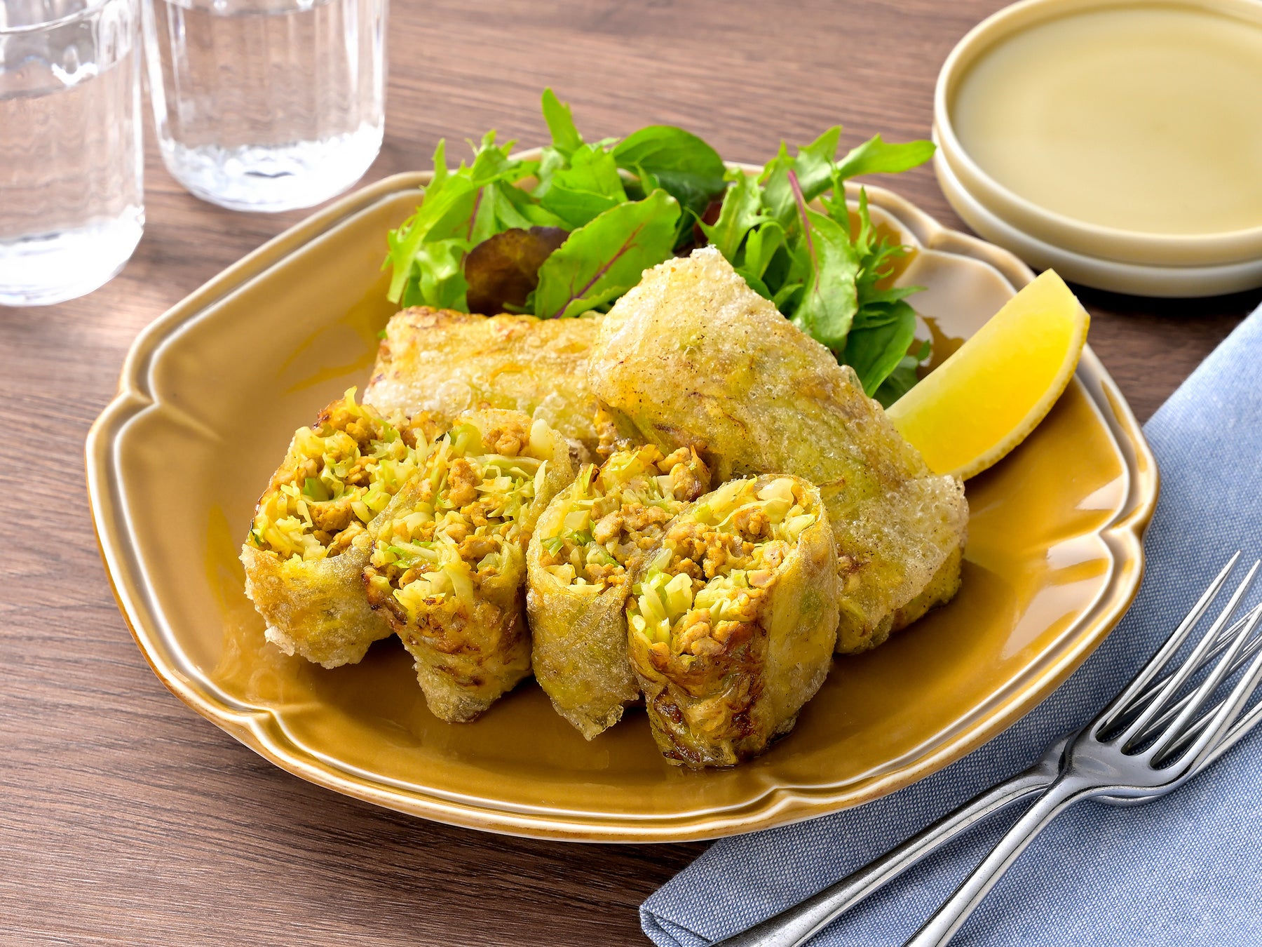 「マギー コンソメ 無添加」とライスペーパーで作るキャベツとひき肉の包み揚げ