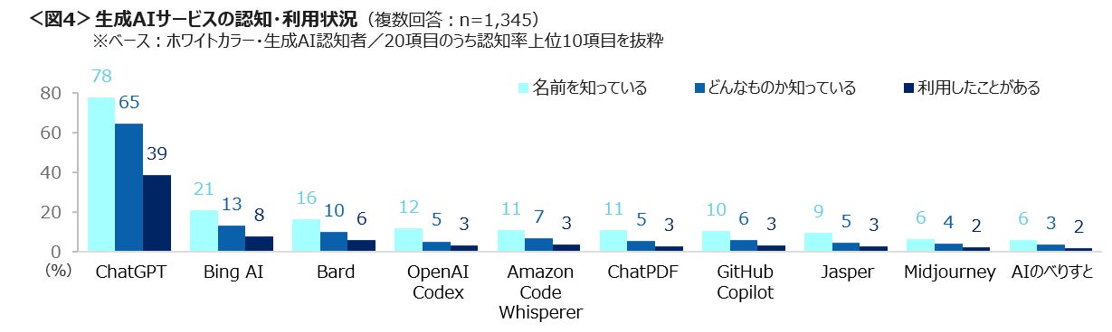 生成AI認知者の中で、会社で生成AIが導入される可能性のあるホワイトカラーに限って、サービスごとの利用状況を確認した。メディアでも話題になっている「ChatGPT」の認知率は78%、利用経験は39%と他サービスに比べ突出して高い。次いで「Bing AI」「Bard」と続く。<図4>