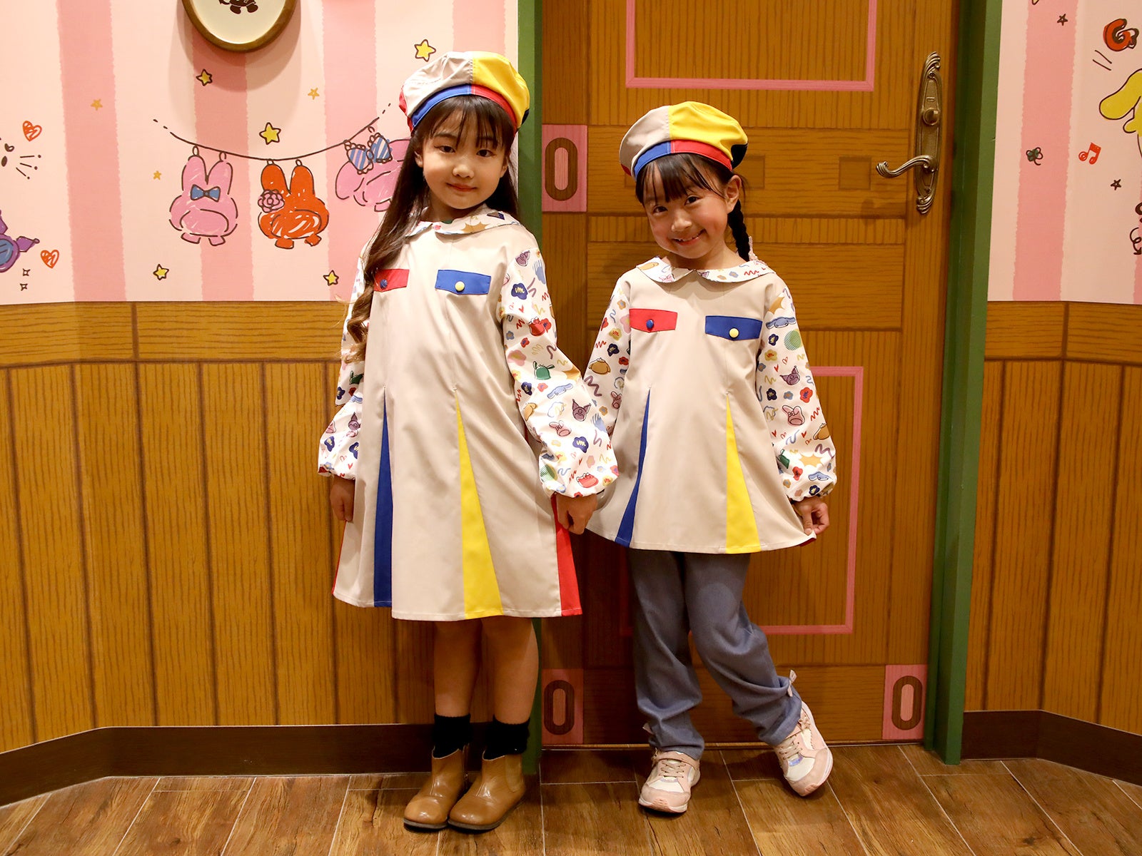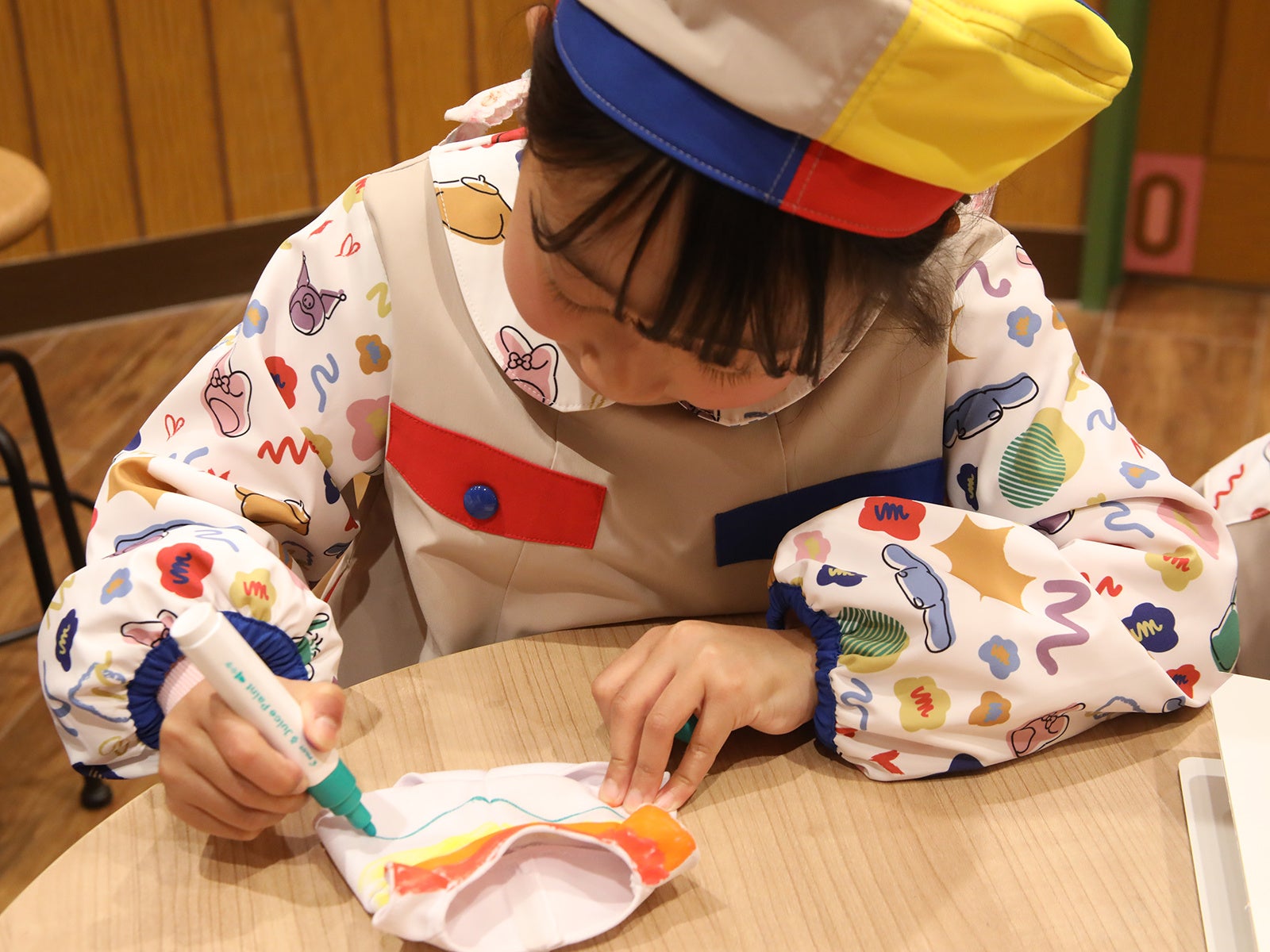 各ワークショップでは、子どもたちがポップで元気なデザインの特別なコスチュームを身につけ、さらに体験を楽しみました。コスチュームは、つなぎ風のワークウェアをベースに、グラフィカルなカラーやサンリオキャラクターのモチーフ柄、トレンドのバレルシルエットを取り入れ、作業着感をなくしたデザインが特徴です。パティシエ体験では、コック帽とエプロン、衣装デザイナー体験では、ベレー帽とカラフルなスモック、キャラクターデザイナー体験では、白衣とメガネを着用し、それぞれの衣装を身にまとった子供たちからは「本当のパティシエになった気分になれる。特別なコスチュームがかわいい!」とコメントがあり、体験がさらに盛り上がりました。また、完成した作品は記念として持ち帰ることやご試食が可能で、お子さまだけでなく、見守る親にとっても“体験の思い出”としてお楽しみいただけます。