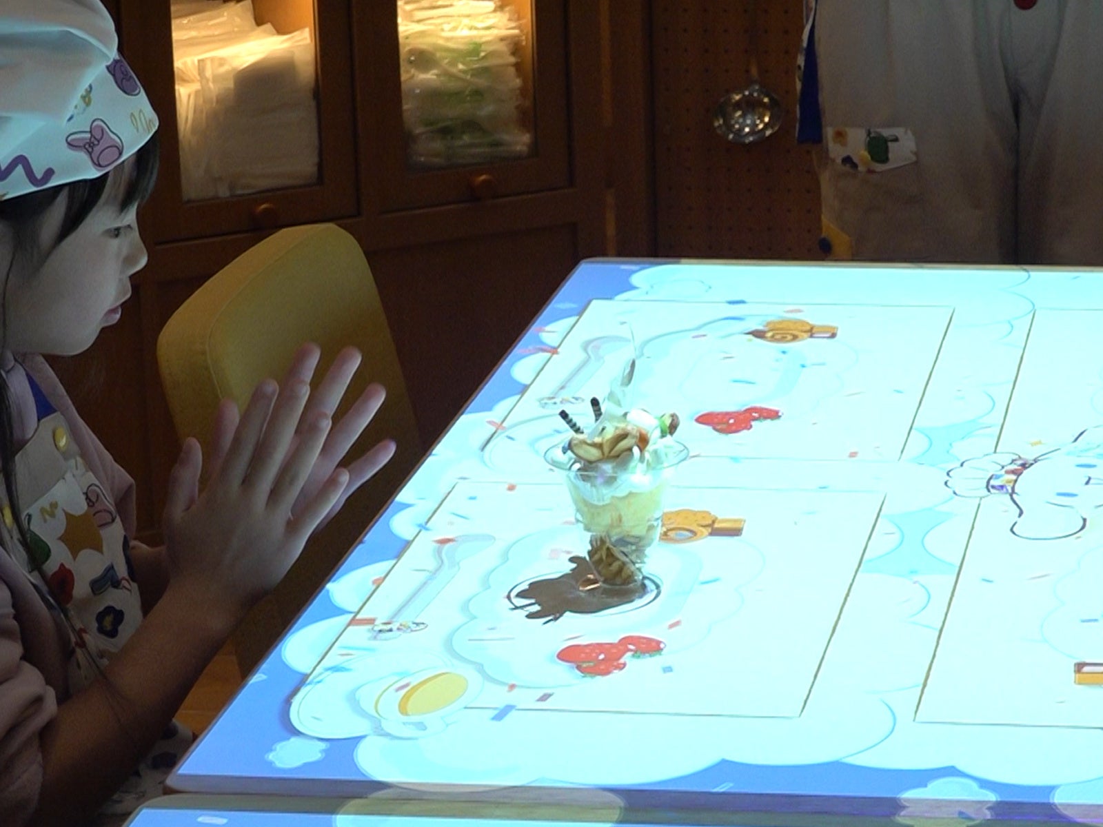 パティシエ体験では、子どもたちがオリジナルのキャラクターパフェをデザインし、自由にデコレーションを楽しみました。トッピングの配置や色の組み合わせを考えながら、思い思いの「かわいいパフェ」を完成させていきます。完成後には、テーブルの上にマッピング演出が展開し、まるで魔法がかかったかのようにパフェの周りが幻想的な映像に包まれ、特別な瞬間を演出します。体験した子どもたちは、「最後の演出が魔法みたい! 」「パフェが光ってすごい!」と驚きの声をあげながら、オリジナルのパフェ作りを楽しみました。