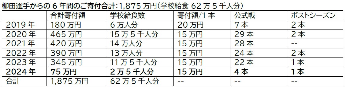 柳田選手は自身の本塁打(ホームラン)が途上国の子どもたちの学校給食支援につながる成績連動型寄付に2019年から取り組んでいます。2024年はシーズン中に4本、ポストシーズンに1本のホームランを打ち、合計75万円の寄付となりました。過去6年間で、合計1,875万円、62万5千人分の学校給食支援をしました。