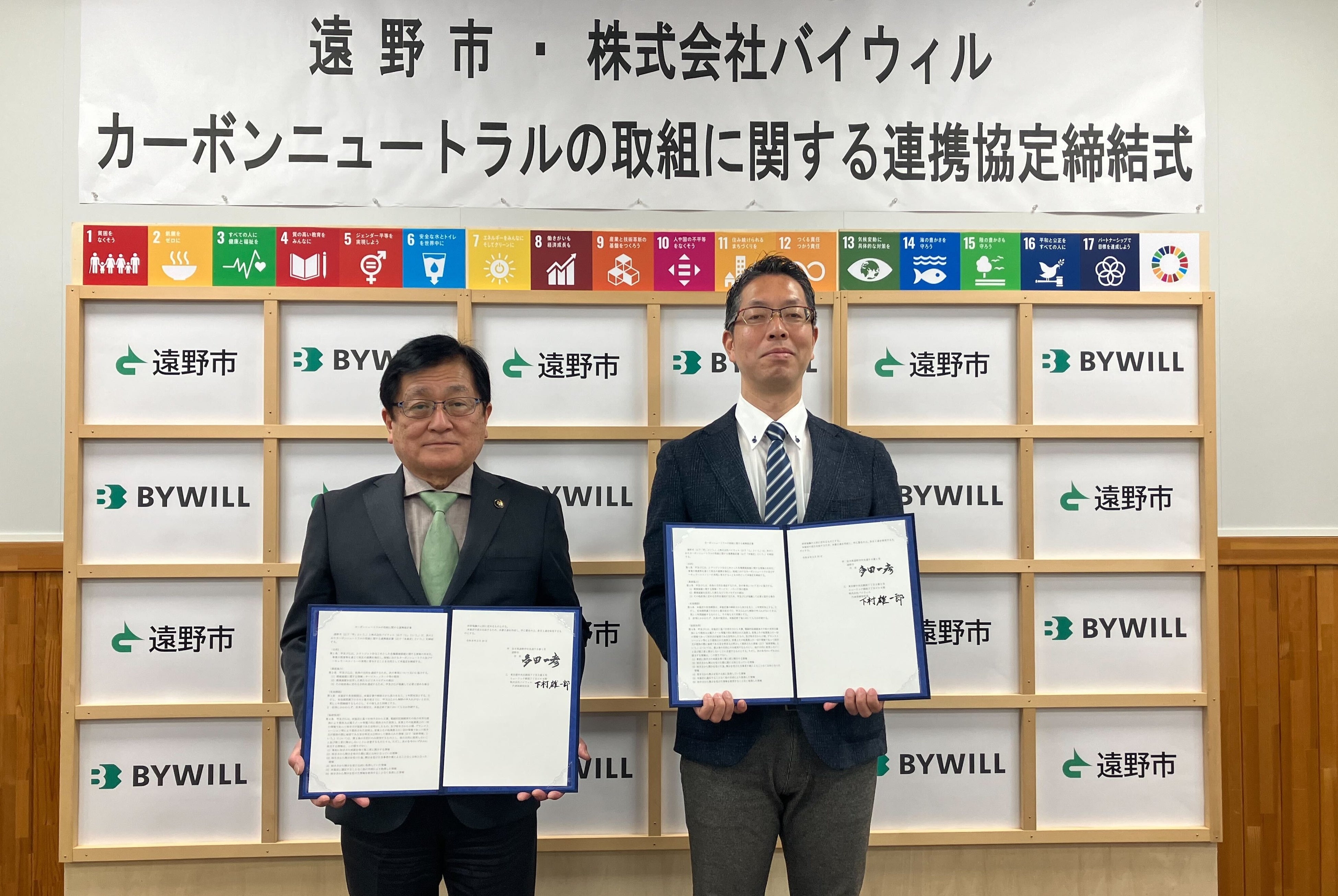 「GXをやりたくなる世界」を目指し、環境価値を活用した経済循環を推進する株式会社バイウィル(本社:東京都中央区、代表取締役社長:下村 雄一郎、以下「バイウィル」)は、岩手県遠野市(市長:多田 一彦、以下「遠野市」)と「カーボンニュートラルの取組みに関する連携協定」を締結しました。