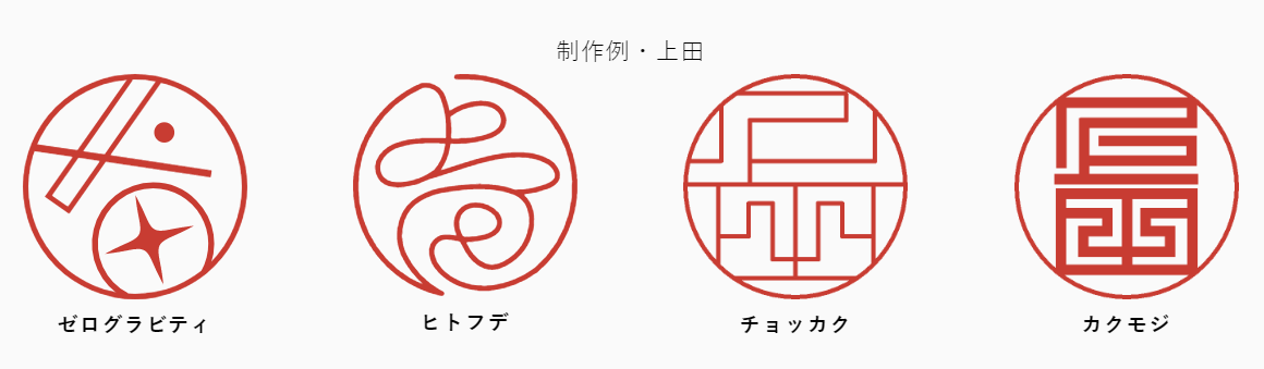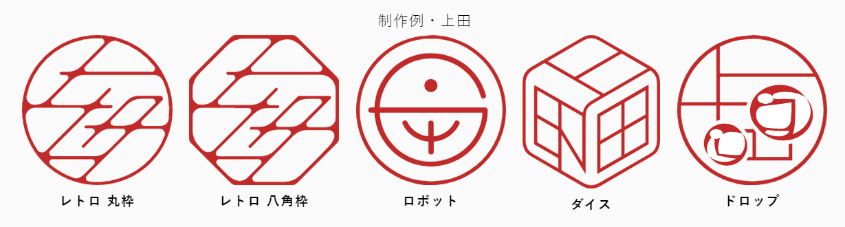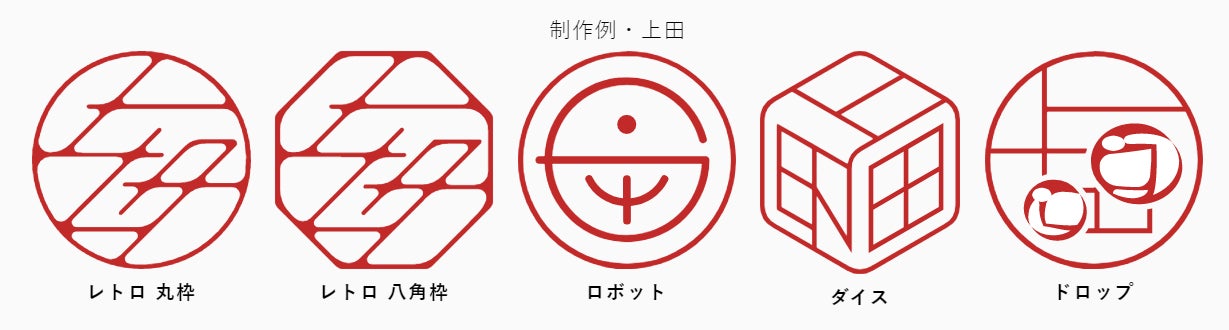 幾何学模様をデザインにとりいれた曲線的でやわらかな印象の「Geometry(ジオメトリー)」に、シンボリックな記号をとりいれた直線的でモダンな印象の「Symbol(シンボル)」、無重力で文字のパーツが浮きあがったような「ZERO GRAVITY(ゼログラビティ)」、一筆書きで書き上げたサインのような「HITOFUDE(ヒトフデ)」。涼しげでありながらどこかレトロな雰囲気を感じさせる「RETRO(レトロ)」、未来の漢字をイメージした「ROBOT(ロボット)」、サイコロのような三面立体に文字を配置した「DICE(ダイス)」など、従来のはんこのイメージを覆すユニークなデザインを選ぶことができます。
