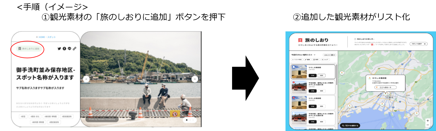 サイト内の気になる観光素材(スポットや体験)を「お気に入り」し、自分だけのリスト(旅のしおり)を作成できる機能。リストは、友人や家族にシェアしたり、SNS等を通して発信できます。